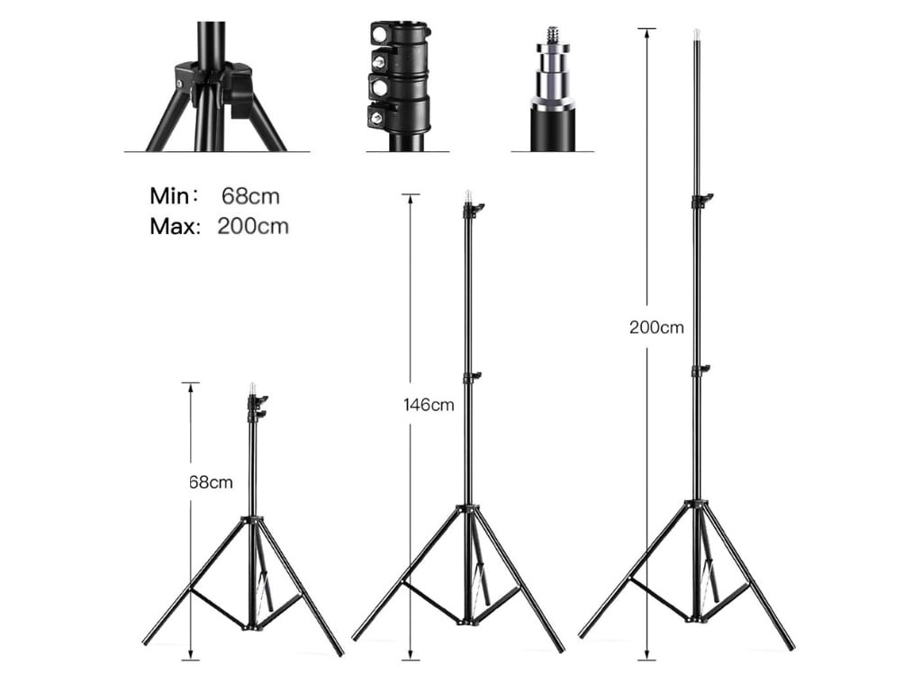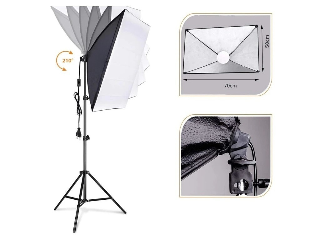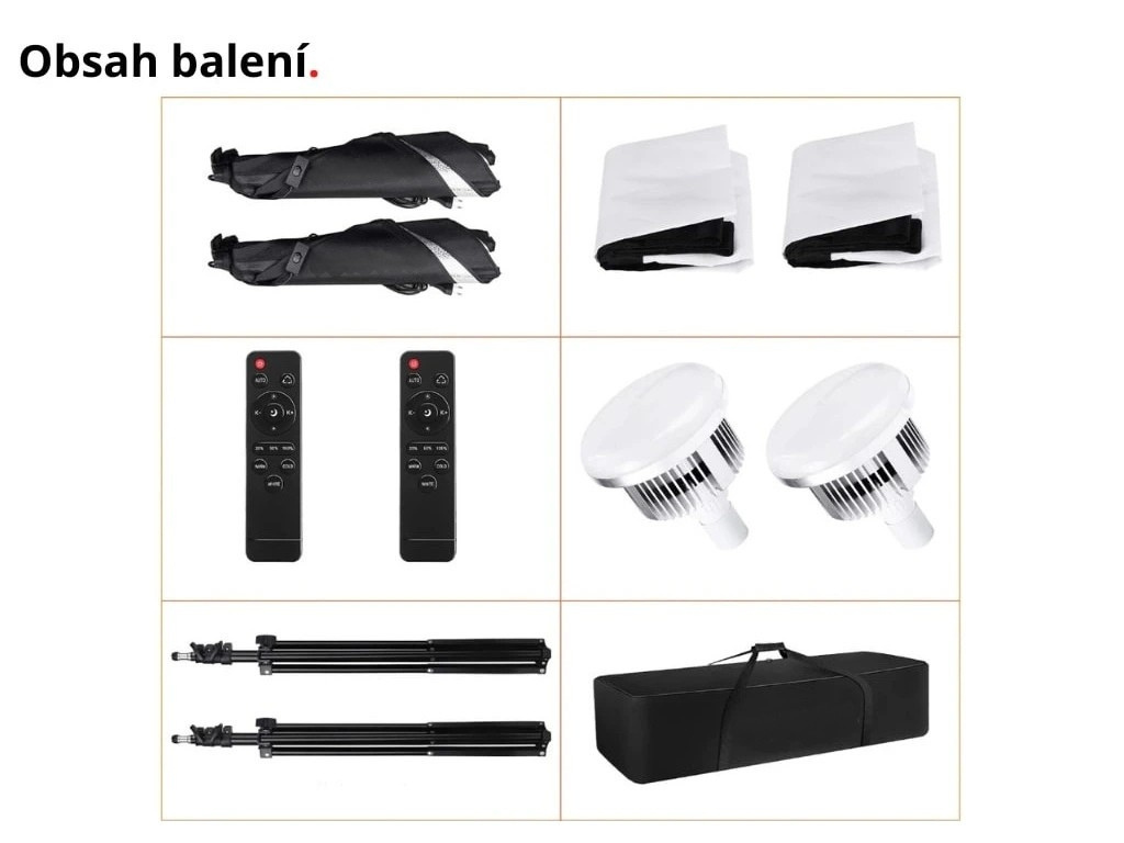 Dvě profesionální foto lampy s neuvěřitelným celkovým výkonem 9000 lumenů mají 200cm vysoké stativy a ovládají se pomocí dálkového ovladače. Jeden LED softbox má 4500lm a barevná teplota je 3200-6400K, jedná se o jeden z nejvýkonnějších softboxů na trhu.