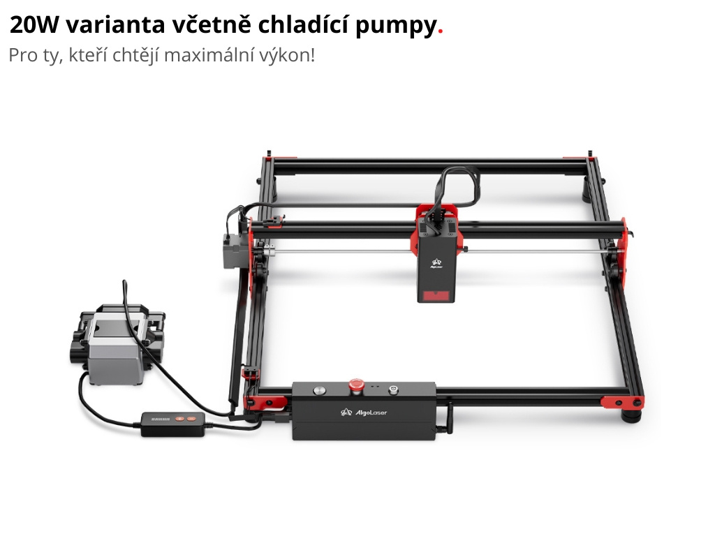 Pro ty, kteří hledají bezkonkurenční výkon, je k dispozici 20W verze s chladící pumpou, díky které bude výsledek ještě kvalitnější. Tato vylepšená verze je ideální pro náročnější projekty a materiály, které vyžadují větší výkon pro dosažení dokonalého gravírování.