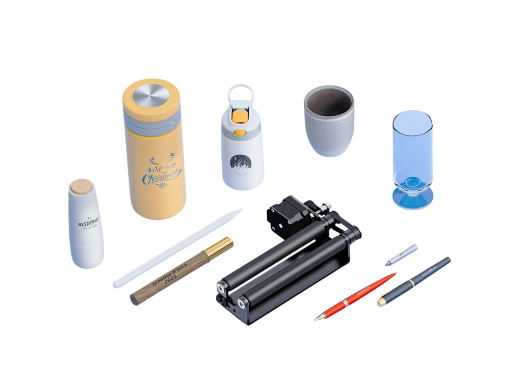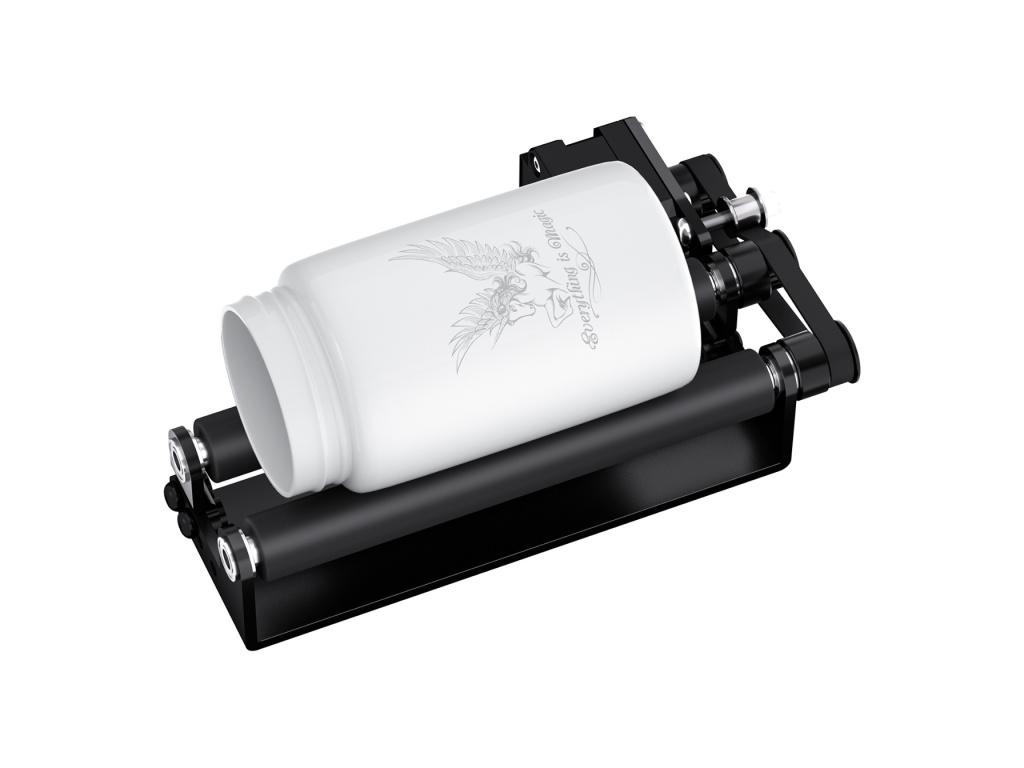 Protože náš svět není jenom placatý, je tu přídavný rotační válec. Nabízí dvě nastavitelné úrovně rozestupu, díky nimž je vhodný pro objekty různých velikostí. Rozsah posuvu válečků 5mm–13mm umožňuje gravírování předmětů o průměru 5mm–100mm. Montáž je naprosto jednoduchá, stačí valeček připojit k gravírce přes kabel a je hned připraven k použití.