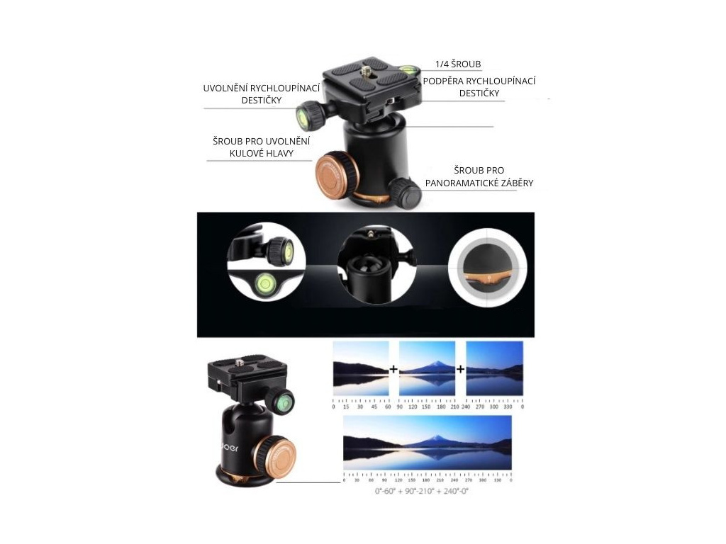 Hlavice stativu je vybavená kulovou hlavou otočnou o 360° pro nastavení různých úhlů a získání dokonalých záběrů včetně panoramatických. Pro úplné nastavení stativu do roviny poslouží vodováha s bublinkou. Středový sloupek se může otočit do invertního stavu pro nízký úhel - pro focení z malé výšky. Hlavice je samozřejmě vybavená rychloupínací destičkou s 1/4 šroubem, stativ je tak kompatibilní s většinou DSLR fotoaparátů, digitálních fotoaparátů a videokamer. Připevnit na něj můžete i držák na telefon (není součástí balení).