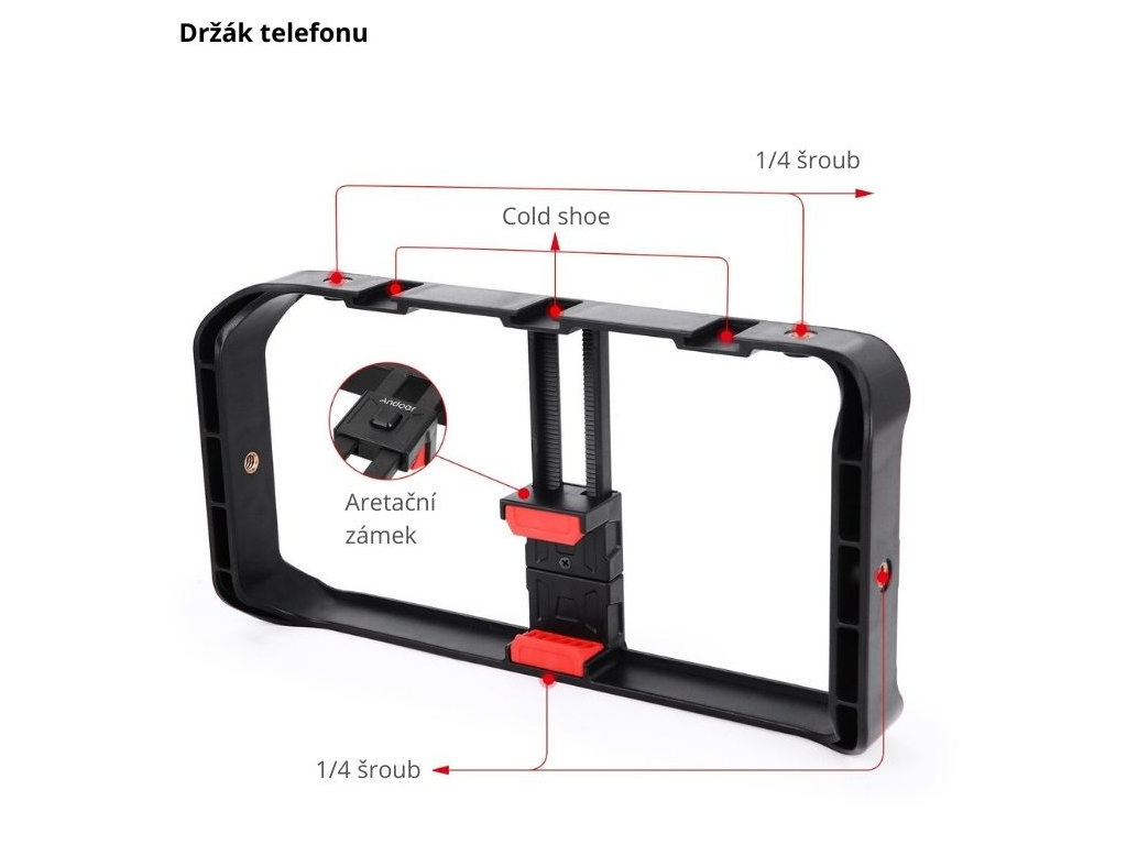 Konstrukce na telefon je vybavená třemi adaptéry cold shoe, vhodné na upevnění mini LED světel a mikrofonu. Zároveň je vybavená pěti 1/4 závity, konstrukci na telefon tak můžete upevnit i na stativ a vytvořit tak super komplet na natáčení videí třeba na YouTube nebo Tiktok. Pomocí adaptéru male to male můžete na konstrukci upevnit i třeba kameru nebo fotoaparát. Adaptér není součástí balení.