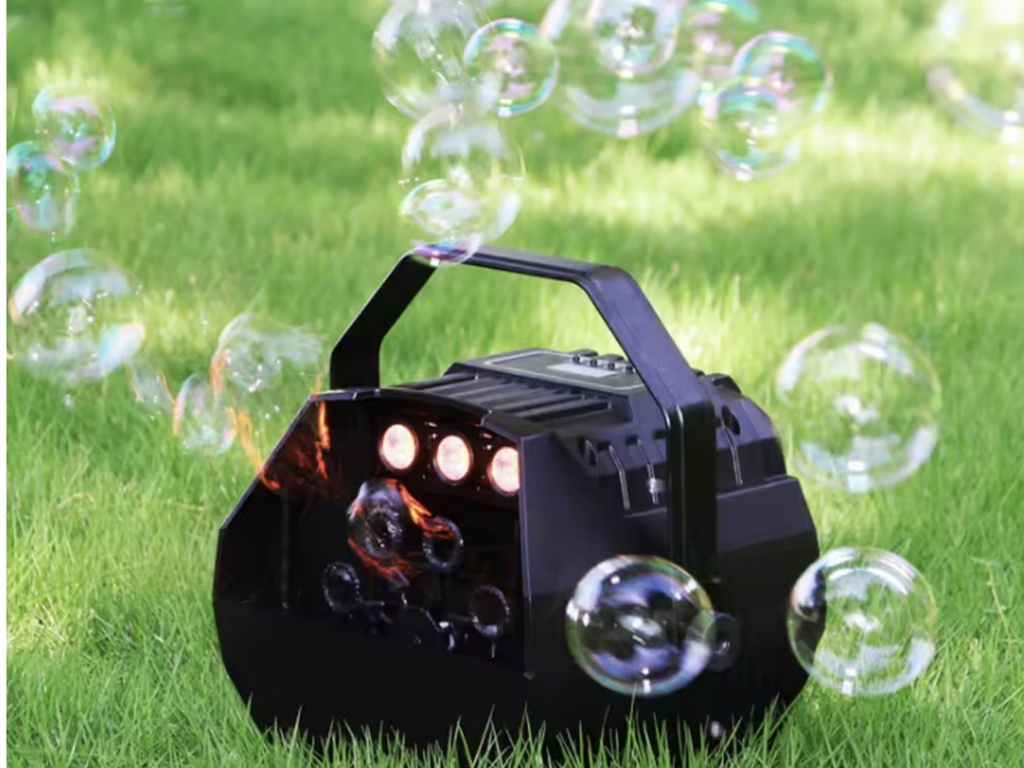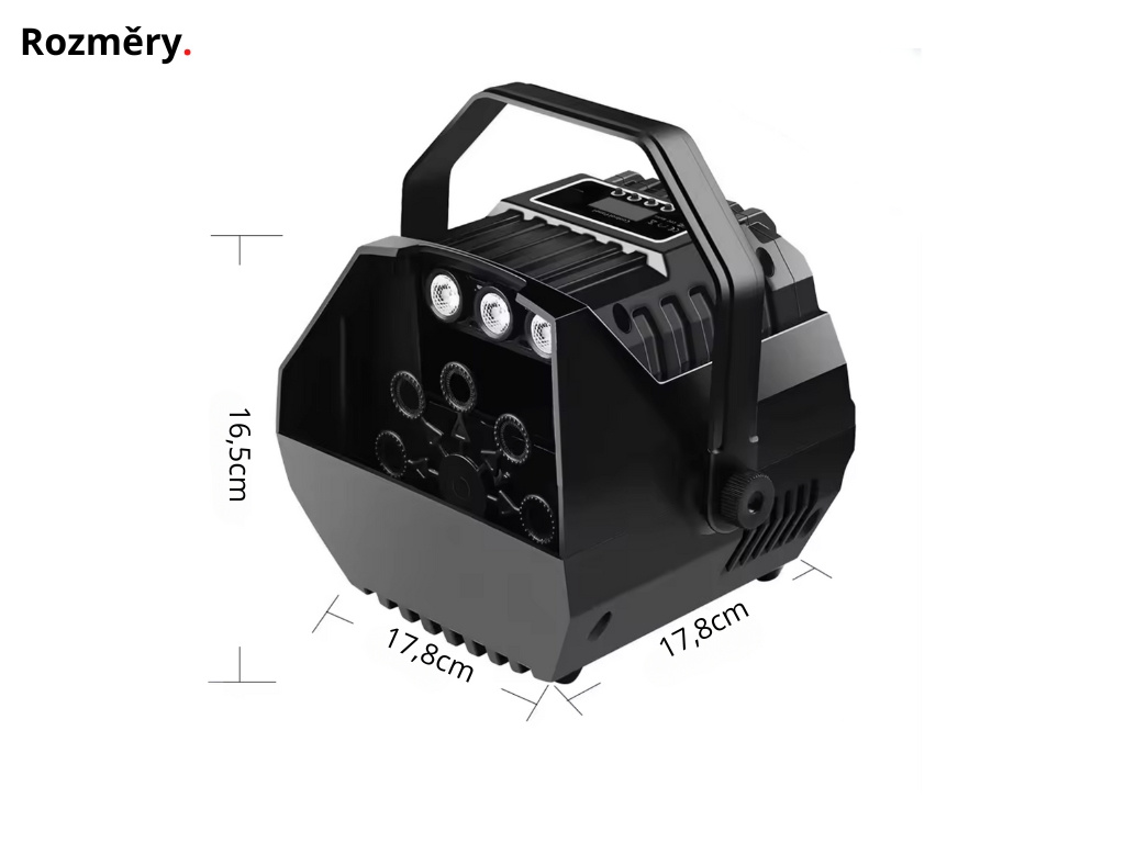Stačí do nádržky nalít bubble roztok, zapojit do zásuvky a show může začít. Bublinám s dosahem až 10m v bezvětrném prostředí budou na cestu blikat 3 RGB světla, která jsou součástí konstrukce.