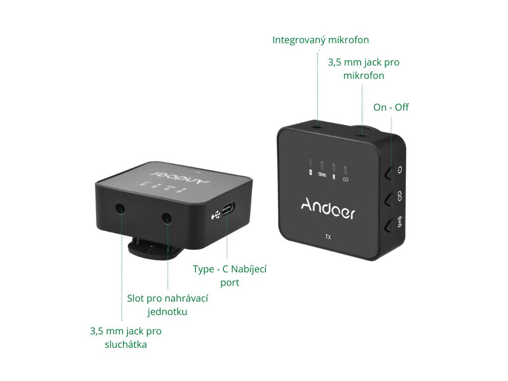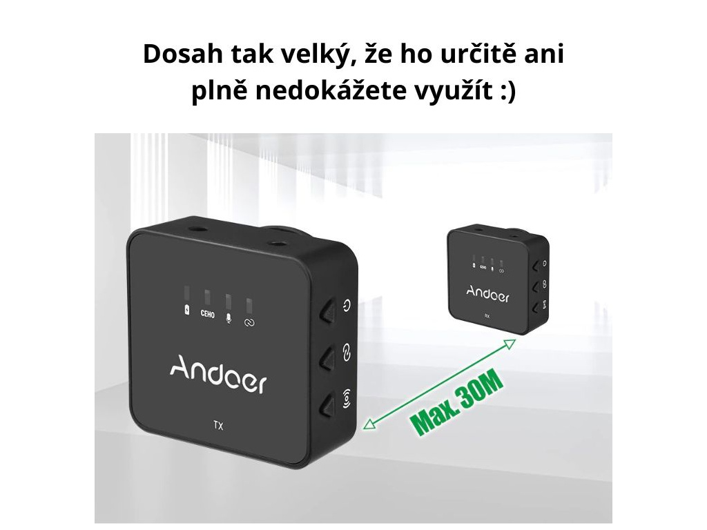 Bezdrátový mikrofon může dosáhnout přenosové vzdálenosti v ideálních podmínkách až 30 m. Mikrofony (TX) vydrží v provozu až 3,5 hodiny, přijímač (RX) až 5 hodin. Mikrofony i přijímač se nabíjí přes kabel USB C, který je součástí balení.
