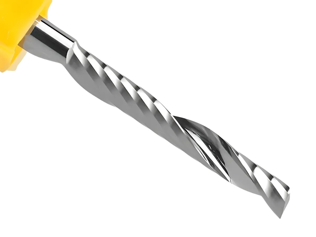 Fréza má jedno ostří s optimalizovanou geometrií pro rychlé a efektivní obrábění i při vyšších otáčkách. Díky „down-cut“ konstrukci (vrták tlačí materiál dolů) je ideální pro obrobení horních vrstev bez odtržení: například u překližky nebo vrstevnatých plastů.