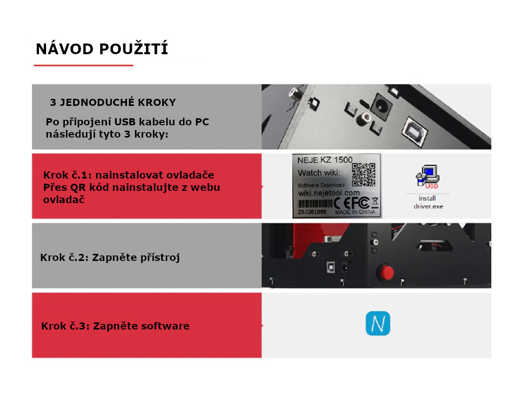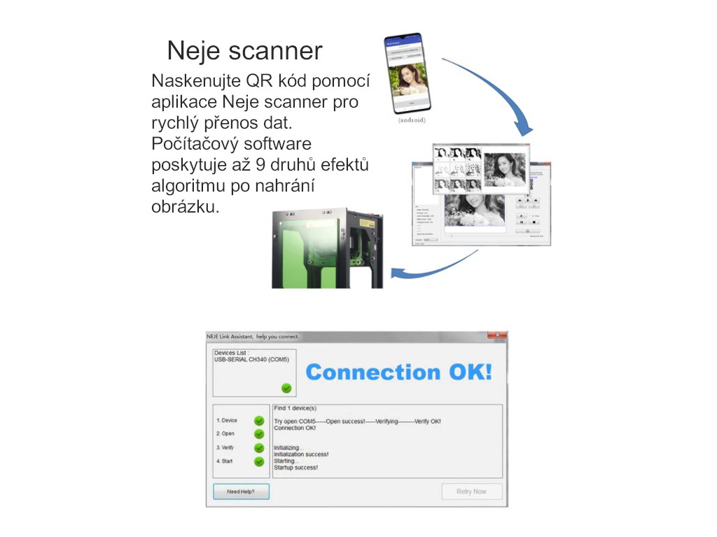 Gravírka je vybavená 445 nm laserovou trubicí, vysoko výkonným laserem, ovládáním TTL se snímáním teploty. Použití je jednoduché, stačí naskenovat QR kód pomocí aplikace NEJE Scanner APP (pouze pro verzi Android) a automaticky se připojí k počítačovému softwaru, který je jednoduchý a snadno použitelný.