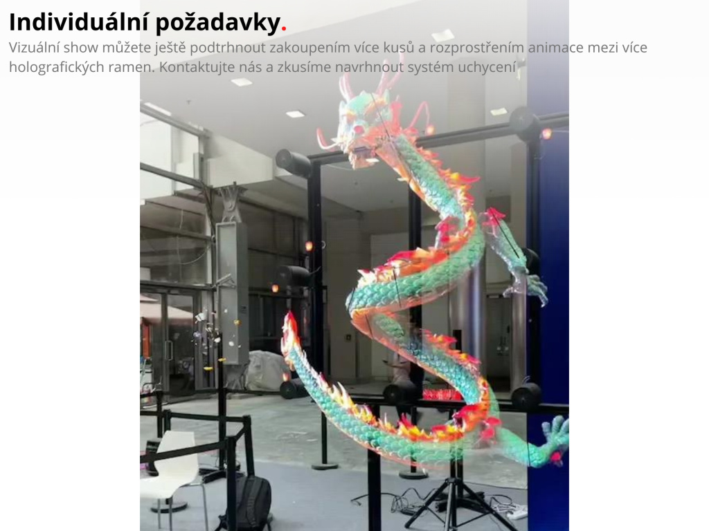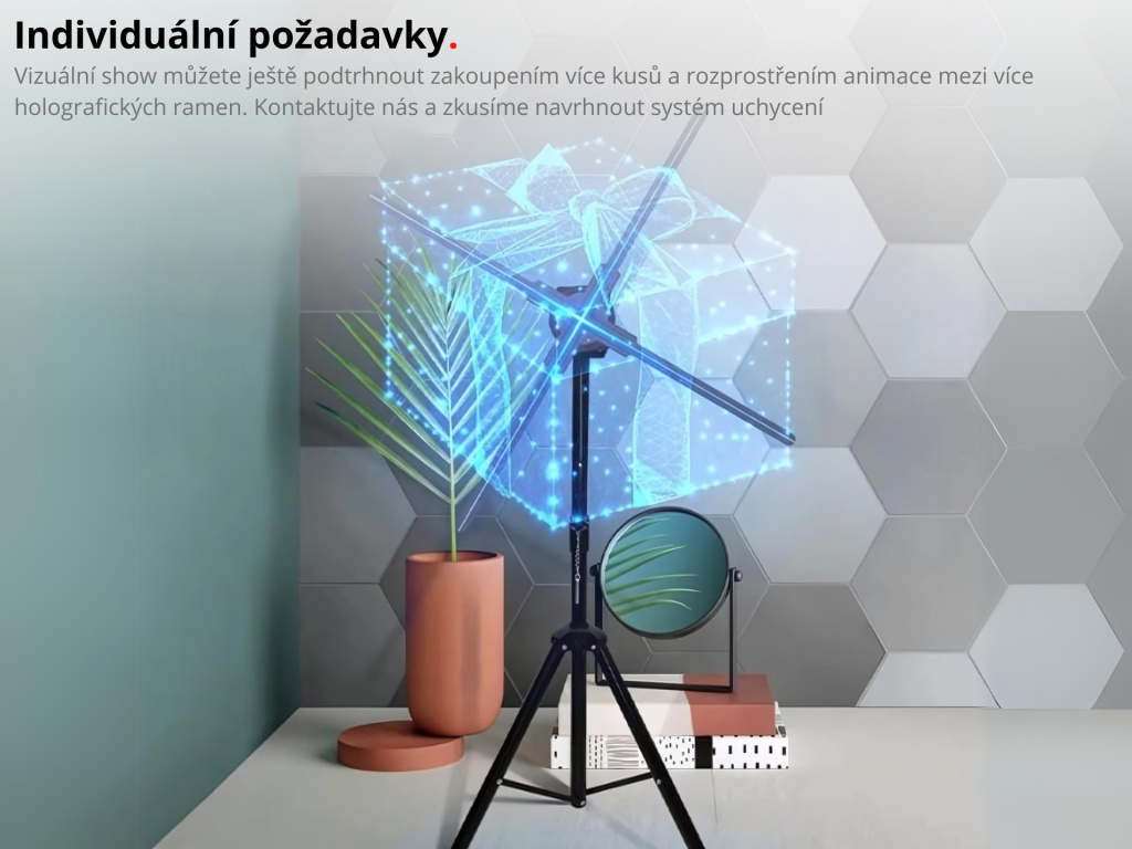 Profesionální řešení pro zobrazování 3D obrazců s transparentním pozadím, které je v této nabídce k dispozici v několika velikostních variantách a my jsme připraveni pro vás vybrat to nejlepší. Krom samotného poradenství při výběru můžeme vyřešit vaše požadavky na zavěšení v prostoru nebo na rozšíření obrazu instalací několika hologramů vedle sebe.