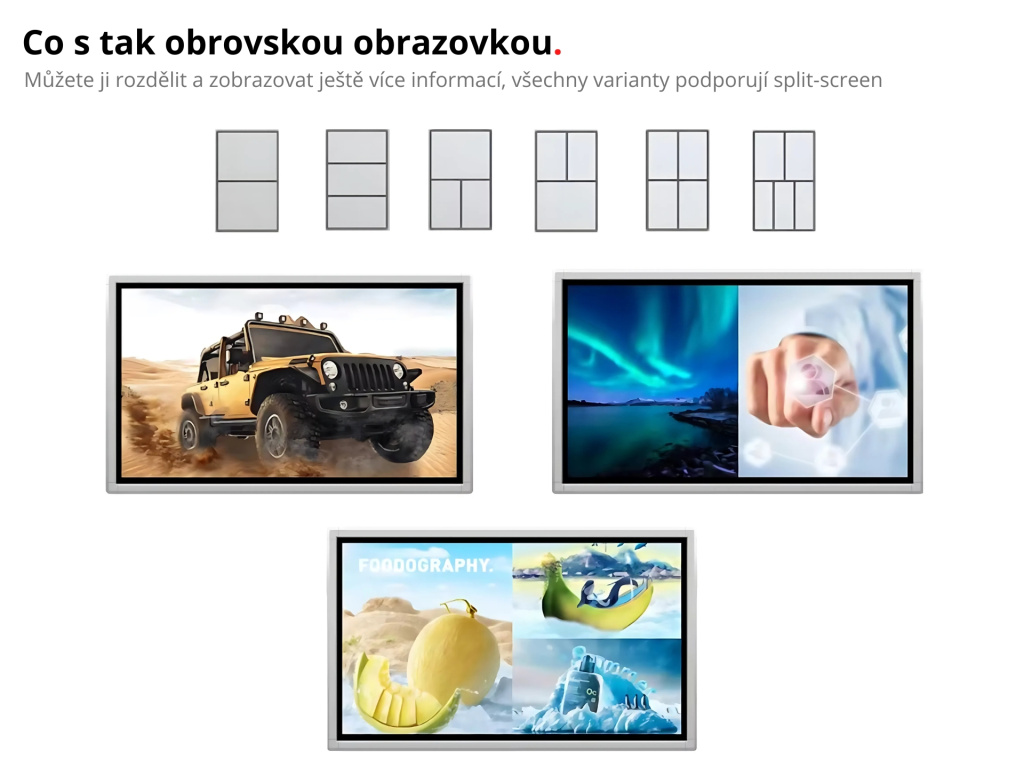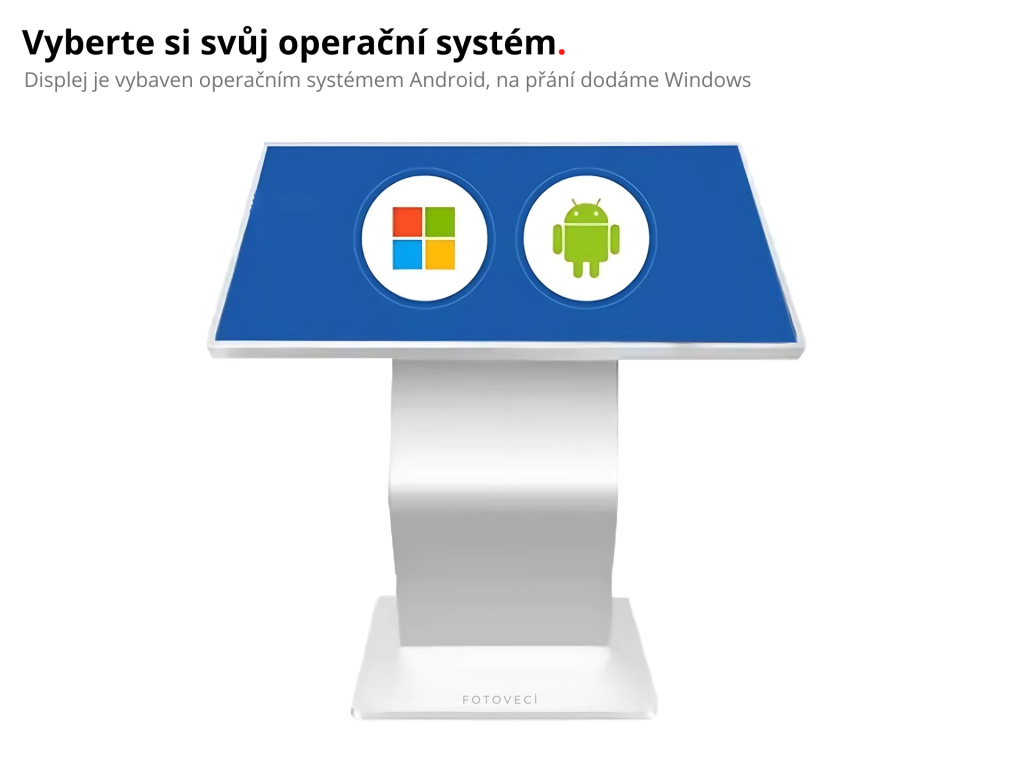 Displej je vybavený operačním systémem Android (na přání můžeme dodat s operačním systémem Windows). Díky WiFi jej můžete využít ke zobrazování webových stánek a stahovat volně dostupné aplikace. Poradí si se všemi běžnými formáty videí, obrázků i audia.