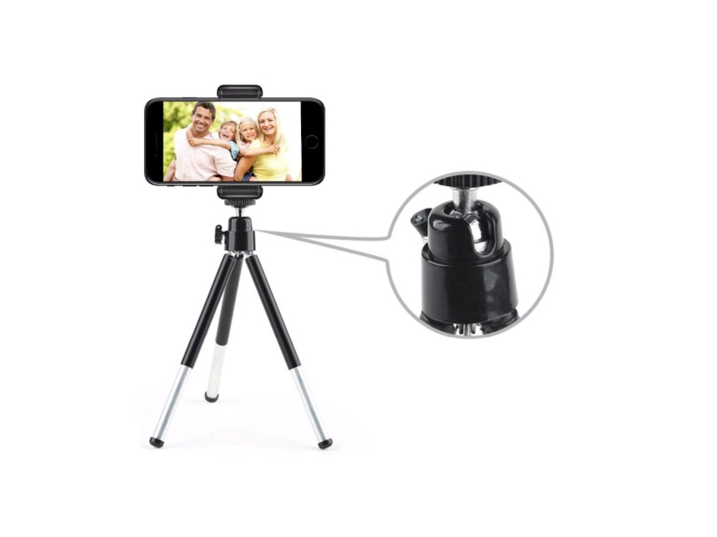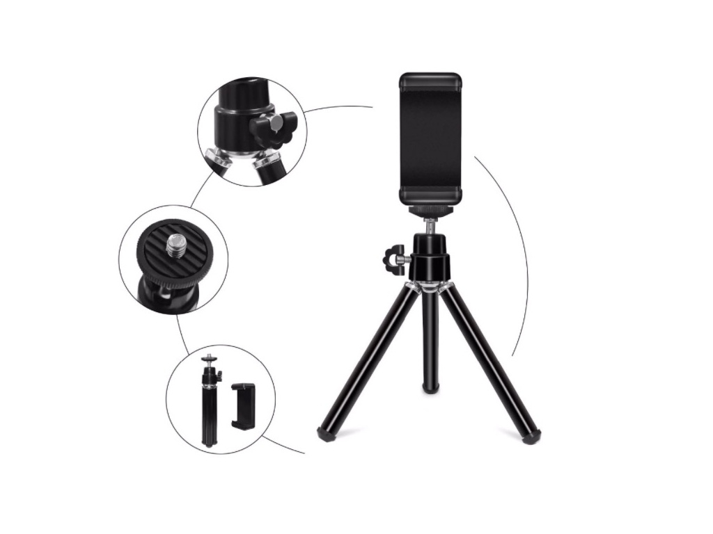 Nejlevnější univerzální řešení stativu na telefon i fotoaparát. Samozřejmostí je klasický závit na všechny fotoaparáty a kamery a v ceně balení je i nástavec na mobilní telefony, který lze otáčet 360 po vertikální i horizontální ose. Adaptér je možno roztáhnout až do šířky 8,7 centimetrů.