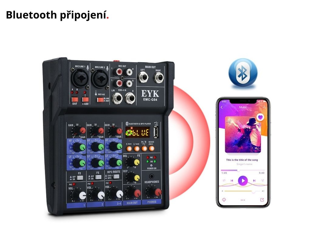 EYK je kompaktní mixážní pult se zabudovaným přijímačem na dva bezdrátové mikrofony, který vám bude k dispozici kdekoli a kdykoli. Pult nabízí dva kombinované XLR vstupy pro mikrofony a hudební nástroje s fantomovým napájením. USB vstup pro hudební přehrávače a tablety. Mobilní zařízení můžete zapojit díky bluetooth technologii. Pult dále disponuje sluchátkovým výstupem a stereo výstupem pro připojení k reproduktoru. Pomocí cinch výstupu můžete zařízení připojit k PC a přes zvukový program (např. AudaCity) nahrávat podcast.