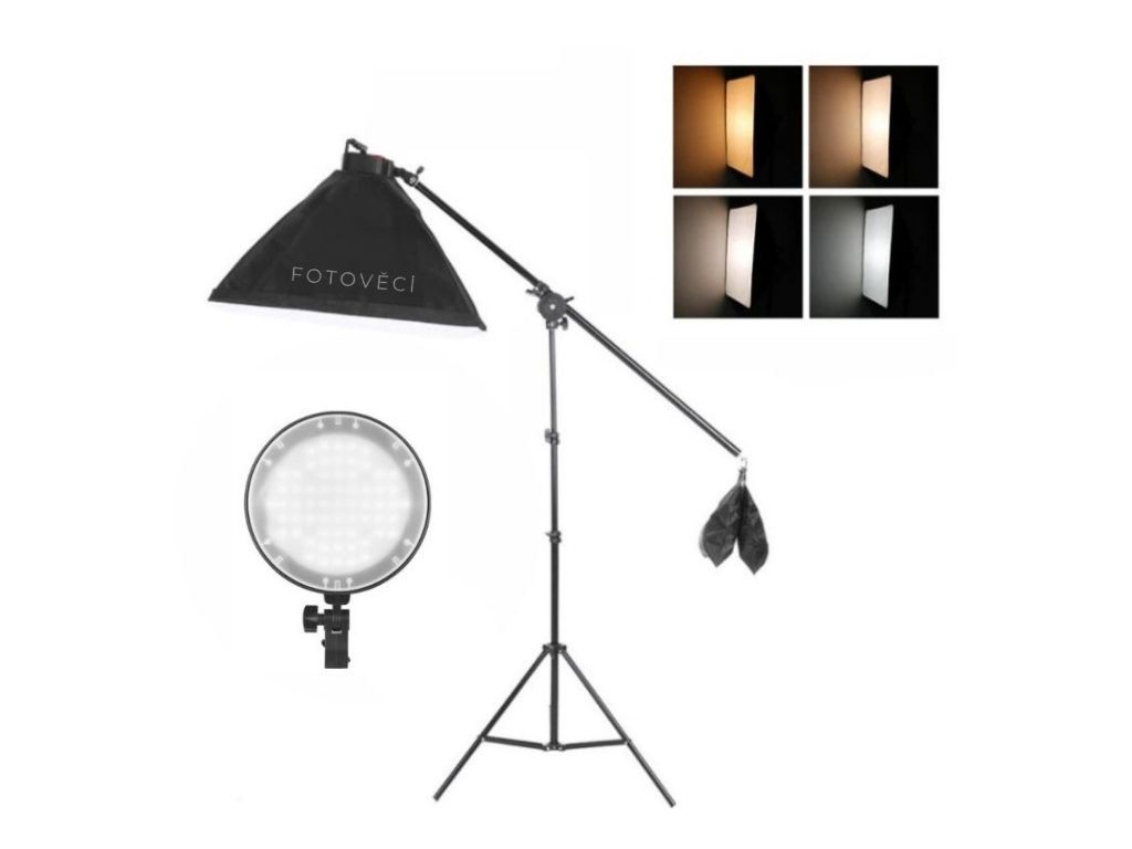 Profesionální studiová LED foto lampa je včetně stativu vysokého 200 cm a jeřábového teleskopického ramene. LED softbox obsahuje 126 LED diod s barevnou teplotou 2700 K a 5500 K, jedná se o jeden z nejvýkonnějších softboxů na trhu. Regulace jasu lze nastavovat pomocí kolečka na zadní straně softboxu. Je ideální pro studiové vybavení jako světlo na focení či natáčení videí. Krásně zjemní stíny, zakryje odlesky a projasní pozadí. Pevná konstrukce zajistí dokonalé vypnutí difuzního plátna, které je odnímatelné. Pomocí jeřábového ramene můžete dostat softbox do velké výšky a nasvítit tak scénu ze shora.