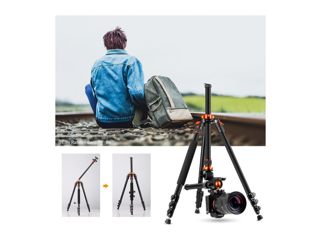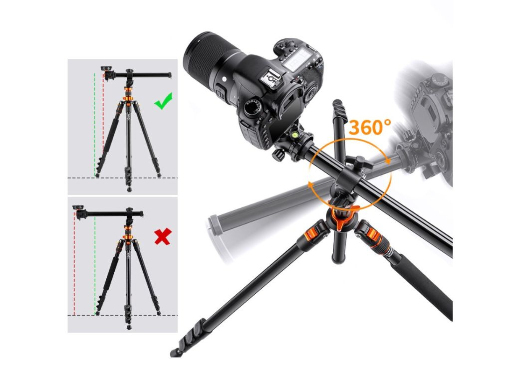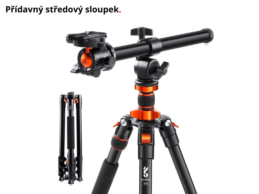 Tělo stativu je z opravdu robustní slitiny hliníku a je velmi stabilní. Stativ má přídavný otočný středový sloup, takže se v případě potřeby můžete dostat mimo osu stativu a skvěle fotit flatlay fotografie jídla, produktů atd.