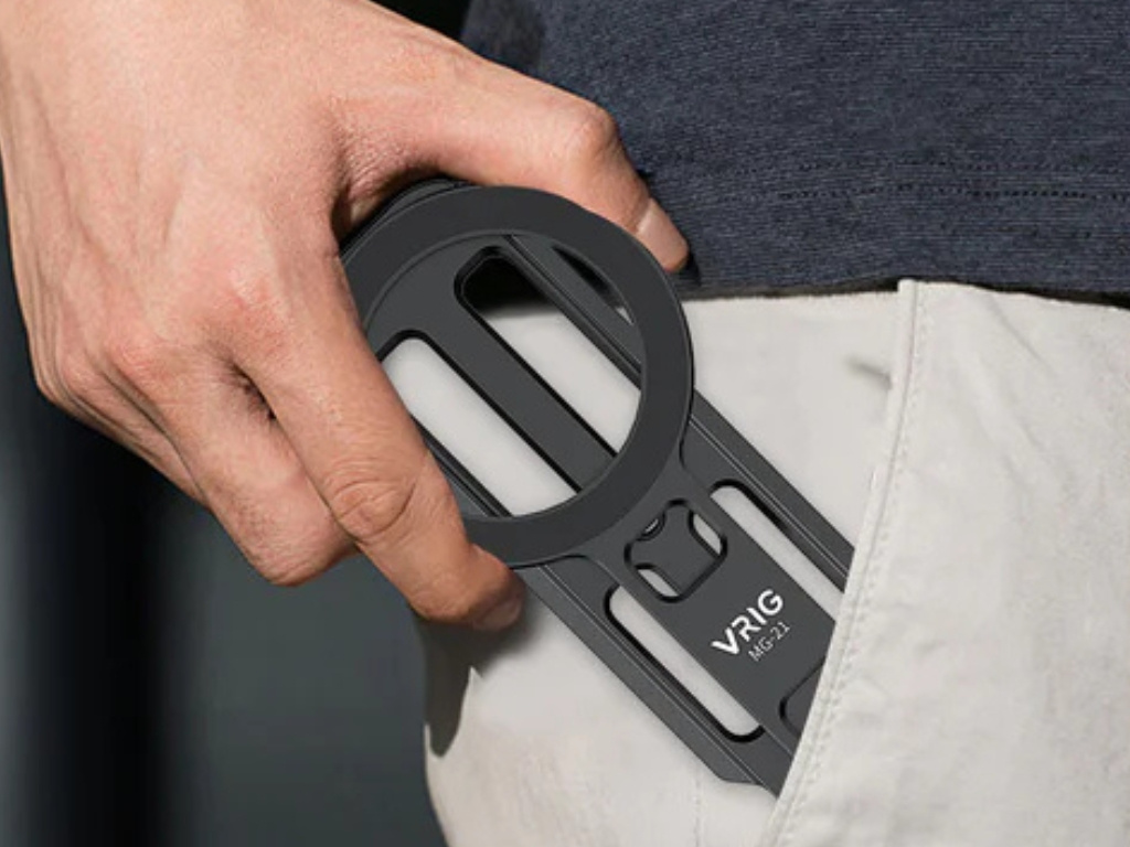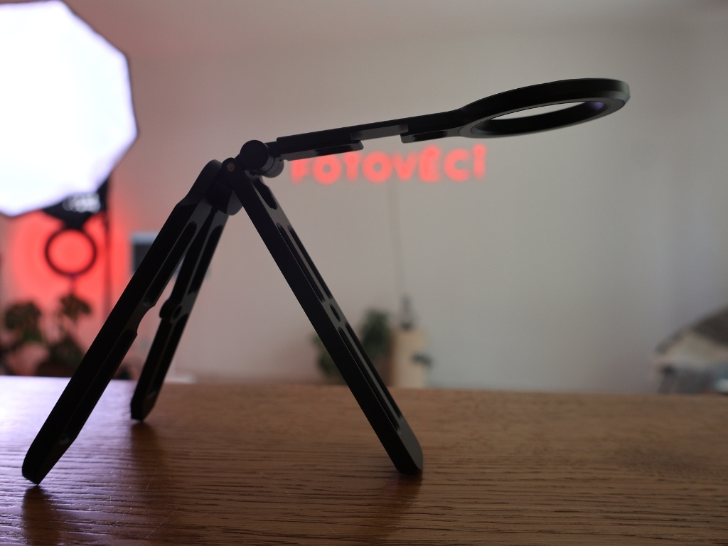 Tělo z uhlíkových vláken a hliníkové slitiny váží pouhých 114g, ale díky výsuvným nohám s protiskluzovými podložkami zajistí pevnou stabilitu i v terénu. Magnetický úchyt (až 1,3kg síly) bezpečně podrží MagSafe iPhony nebo jakýkoliv jiný telefon přes přiložený kovový kroužek.