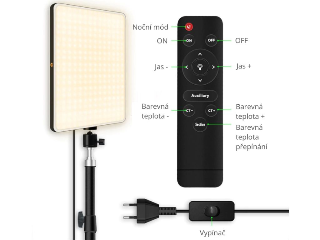 Stativ je výškově nastavitelný a jeho maximální výška je až 44 cm. Zároveň lze stativ natáčet až o 90° díky ohebnému kloubu. LED panel je také vybavený dálkovým ovladačem a můžete si tak nastavovat intenzitu světla nebo barevnou teplotu. Součástí balení je také kulová stativová hlava, díky které můžete světlo natočit do požadovaného úhlu. Maximální námi naměřená svítivost je skvělých 5500 luxů/0,5 m.