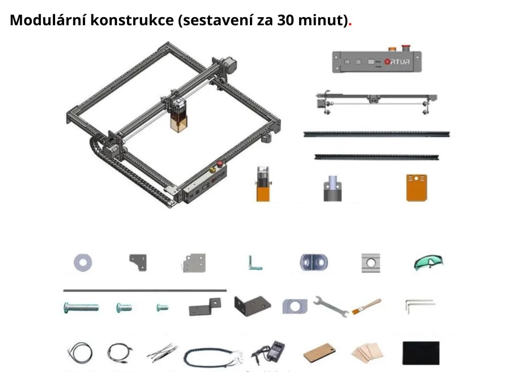 Po sestavení konstrukce (zabere cca 30 minut) se stroj ovládá přes klasický desktop nejlépe s Windows MacOS nebo Linux. Kompatibilní je s běžně dostupnými software Laser GRBL (všechny důležité funkce zdarma, pouze pro Windows) nebo LighBurn (placené cca 60$, profi, Windows, MacOS, Linux), odkazy na software jsou samozřejmě i součástí balení.
