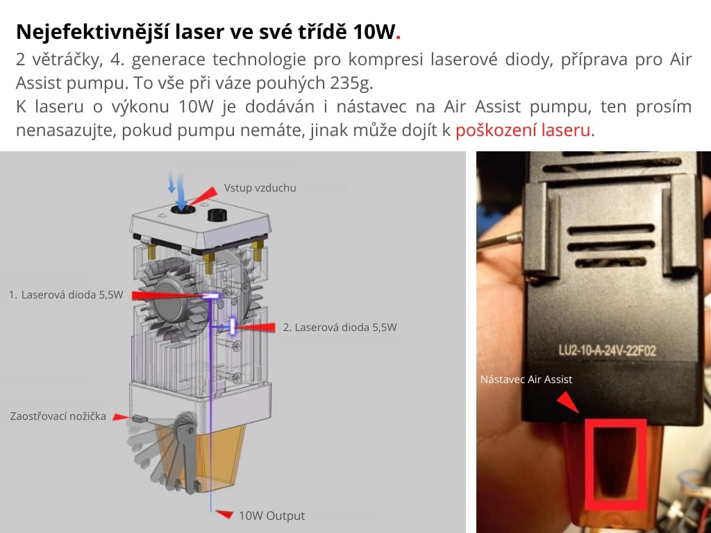 - Optický výkon laseru: 5500mW (model LU2-4 SF) nebo 10000mW (model LU2-10A) dle výběru z nabídky (do vyprodání), k laseru je dodáván i nástavec k připojení Air pump, ten nepřipojujte pokud Air pump nemáte