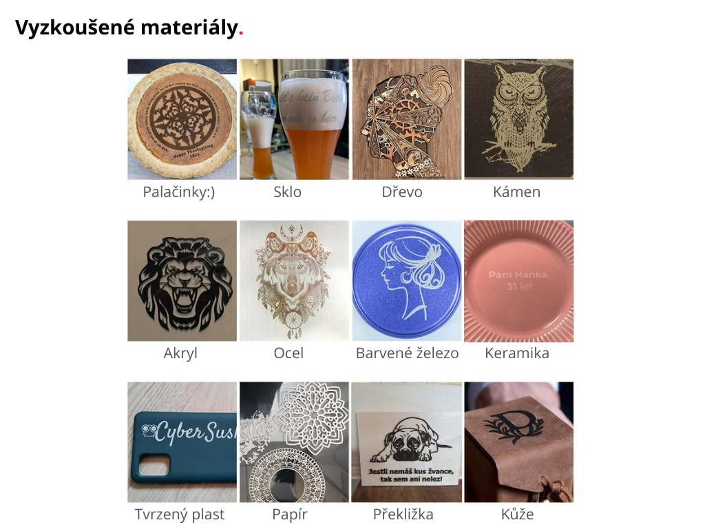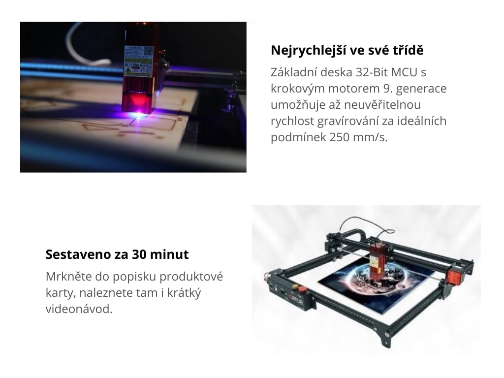 - Rychlost gravírování: 10 - 250mm/s (nejrychlejší ve své třídě)