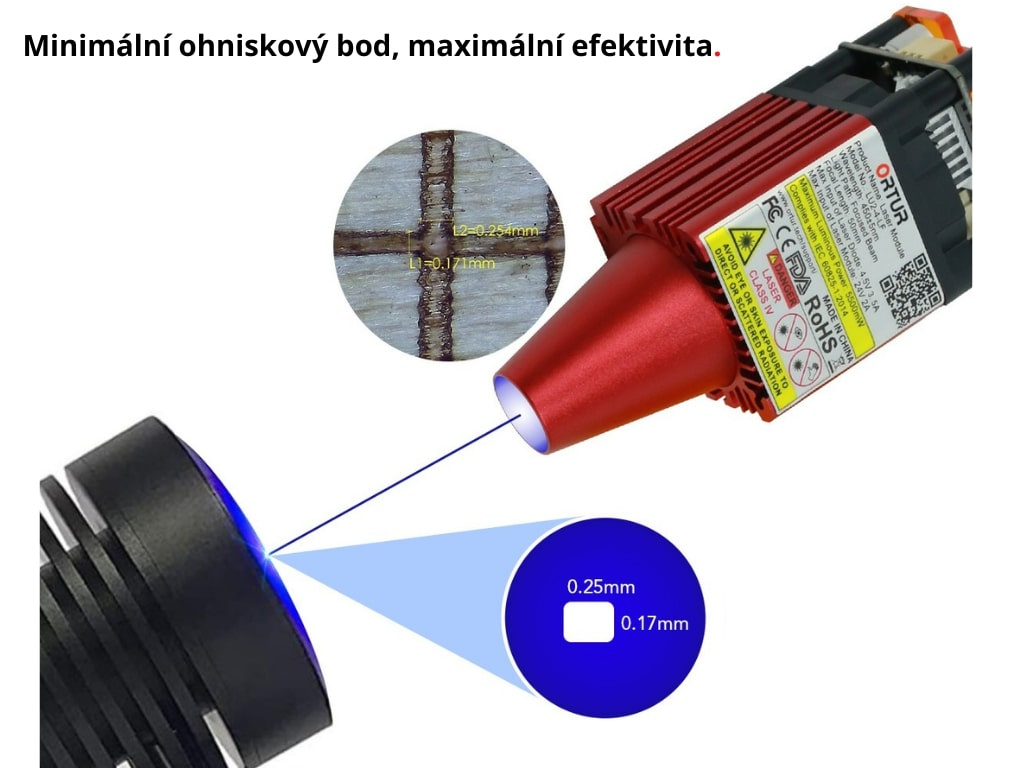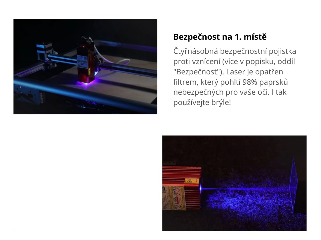 Tento CNC gravírovací stroj je bezpečnostní třídy 4 a může způsobit vážné a trvalé poškození nebo úplnou ztrátu zraku, popálení a jiné úrazy. Nikdy se nekoukejte přímo do laseru a to ani s ochrannými brýlemi. Nenechávejte se strojem pracovat děti. Odražený paprsek na vzdálenost několika metrů může způsobit slepotu. Zároveň může odraz laseru způsobit vznícení některých materiálů a hrozí tak vznik požáru. Nikdy tak nenechávejte přístroj bez dozoru a po použití ho vždy vypněte, nejlépe ze zdroje napájení.