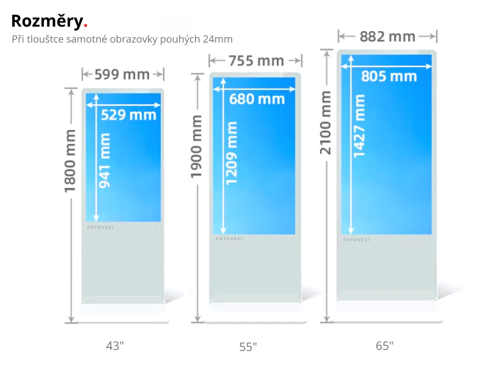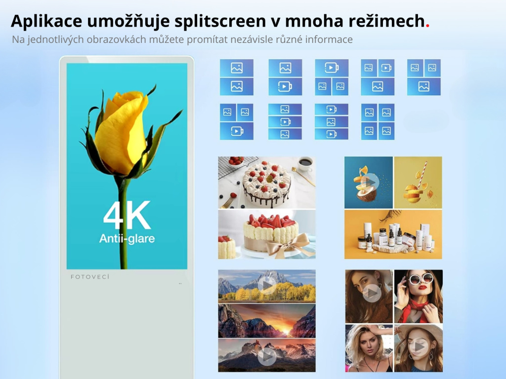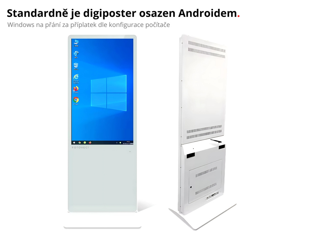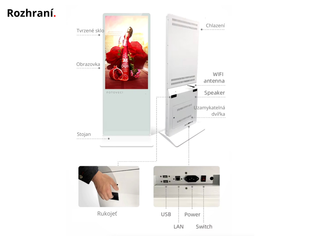 Skvěle se hodí pro showroomy, veletrhy, gastronomii i vstupní prostory. Vzhledem k jednoduchému touch screen ovládání ho můžete využít i jako infokiosek. Dva integrované reproduktory a LED osvětlení upoutají pozornost naprosto kdekoliv.