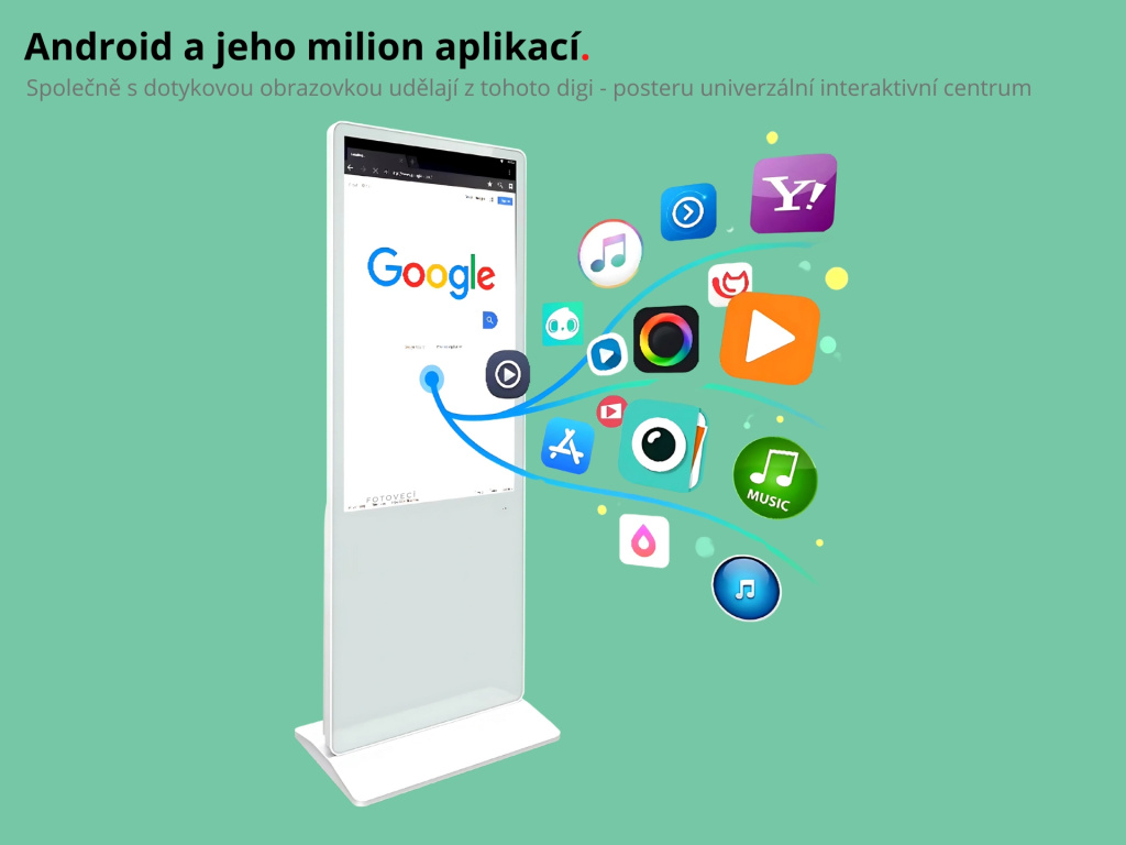 Displej běží na Android, který umožňuje snadné ovládání přes dotykovou obrazovku (která lze uzamknout) nebo dálkové ovládání. Podporuje všechny běžné formáty videí, audia a obrazů, a díky WiFi můžete zobrazovat webové stránky a stahovat volně dostupné aplikace.