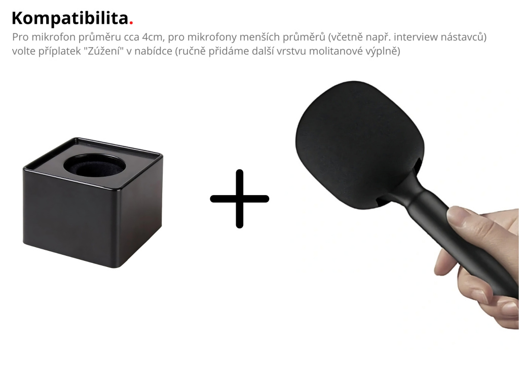 Kostka je kompatibilní s mikrofony o průměru 4cm (hlavu si s tím nelámejte, je to drtivá většina klasických ručních mikrofonů). Pokud chcete použít kostku v kombinaci s našimi interview nástavci, zvolte příplatek "Zúžení" výše v nabídce.