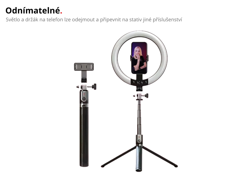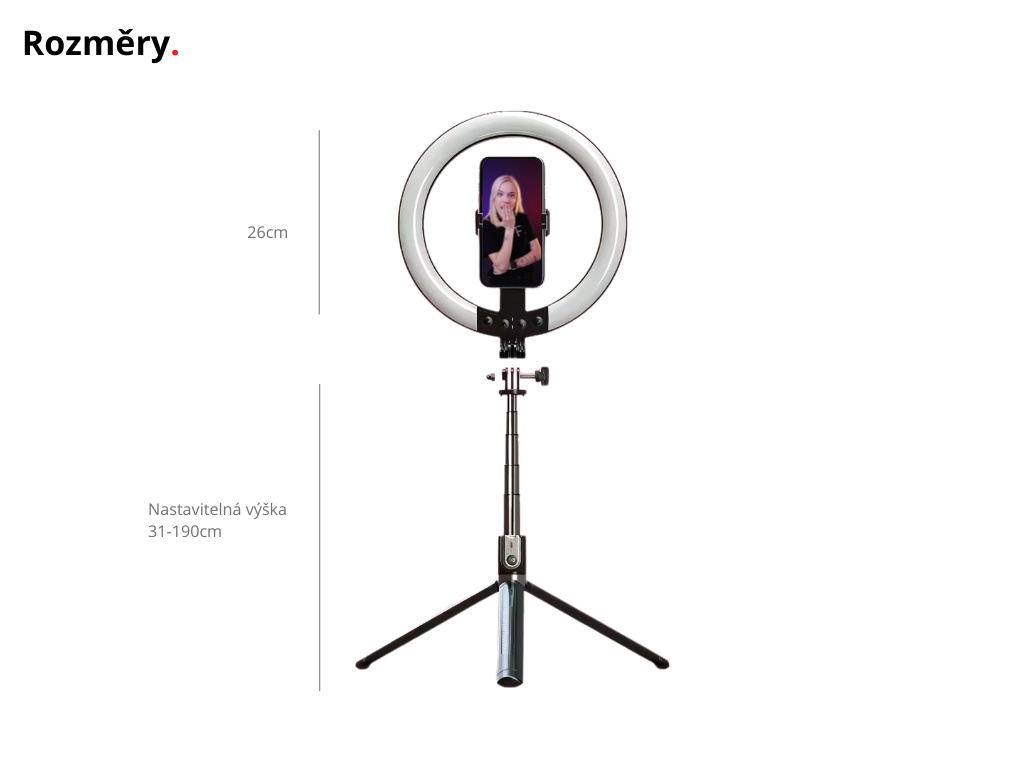 - 1x selfie tyč (stativ) s kruhovým světlem