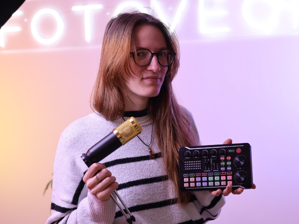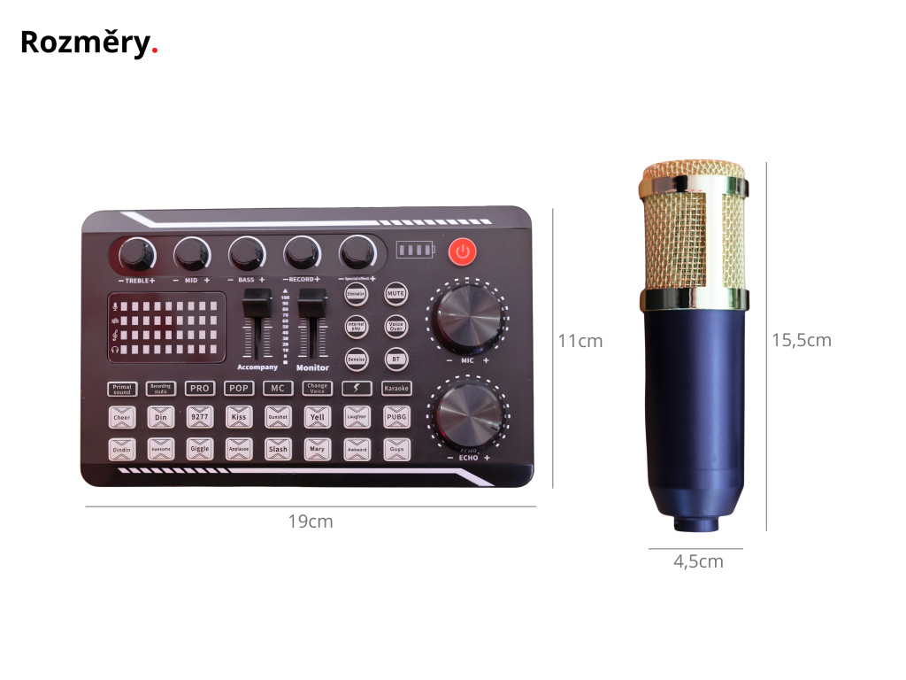 Součástí setu je také přehledná zvuková karta, která nabízí ovládání hlasitosti, basů, efektů i samotného nahrávání. Díky vestavěné lithiové baterii ji můžete používat i tam, kde není zásuvka, a připojení přes Bluetooth umožňuje jednoduše přehrávat doprovodnou hudbu přímo z telefonu. Ovládání je intuitivní, takže i začátečník rychle pochopí, jak s kartou pracovat.