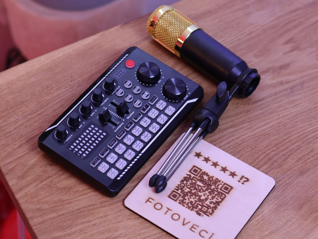 Součástí setu je také přehledná zvuková karta, která nabízí ovládání hlasitosti, basů, efektů i samotného nahrávání. Díky vestavěné lithiové baterii ji můžete používat i tam, kde není zásuvka, a připojení přes Bluetooth umožňuje jednoduše přehrávat doprovodnou hudbu přímo z telefonu. Ovládání je intuitivní, takže i začátečník rychle pochopí, jak s kartou pracovat.