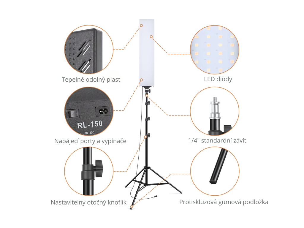 Kromě toho lze světlo používat dvěma způsoby. Buď ho připevníte na stativ, nebo ho necháte samostatně stát na stole či podlaze, takže se snadno přizpůsobí každé situaci.