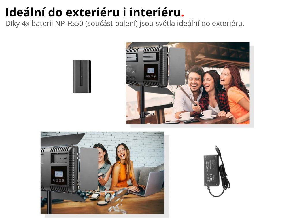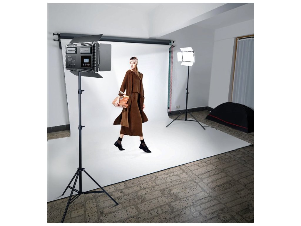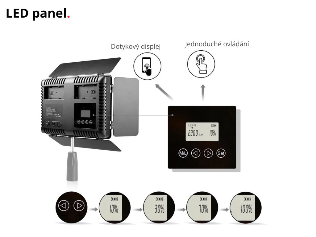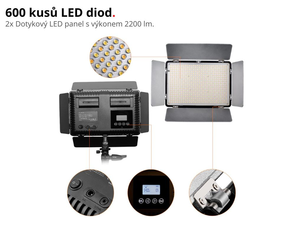 Výkonné LED panely sú skvelým prisvetľovačom do ateliéru. Sú vybavené funkčným dotykovým LCD displejom, ovládanie tiež uľahčujú 2 diaľkové ovládače. Najnižšia hodnota svietivosti je 400 lm, následne je možné postupne zvyšovať o 200 lm až na hodnotu 2200 lm pri každej lampe. LED panely sú osadené 600 kusmi SMD LED diód na ktoré môžete dať biely alebo oranžový difúzor pre nastavenie farebnej teploty svetla. Praktické sú aj odrazné smerovky "barn doors", vďaka ktorým si môžete nastaviť uhol svetla podľa potreby.