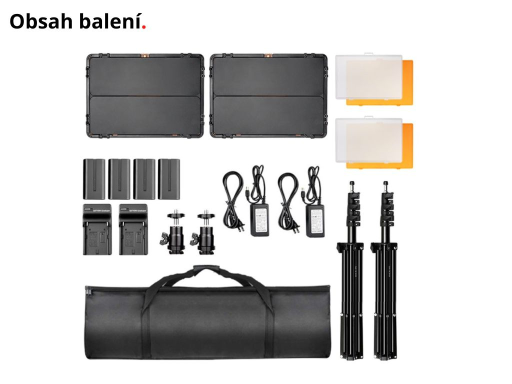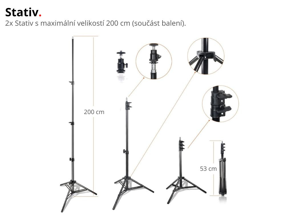 Každý LED panel je usadený na dvojmetrovom statíve a pomocou guľovej statívovej hlavy môžete svetlo naklápať do rôznych uhlov. Svetlo spoľahlivo osvetlí ako detail pri produktovom fotení, tak portréty alebo celej postavy. Foto ani video nie je problém.