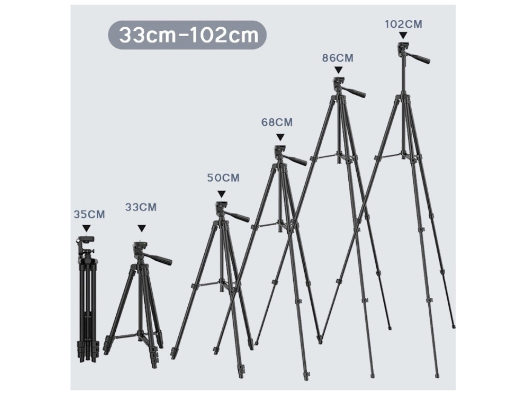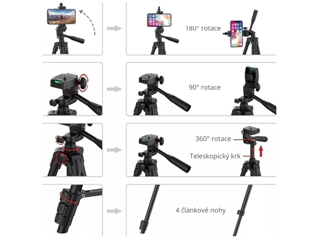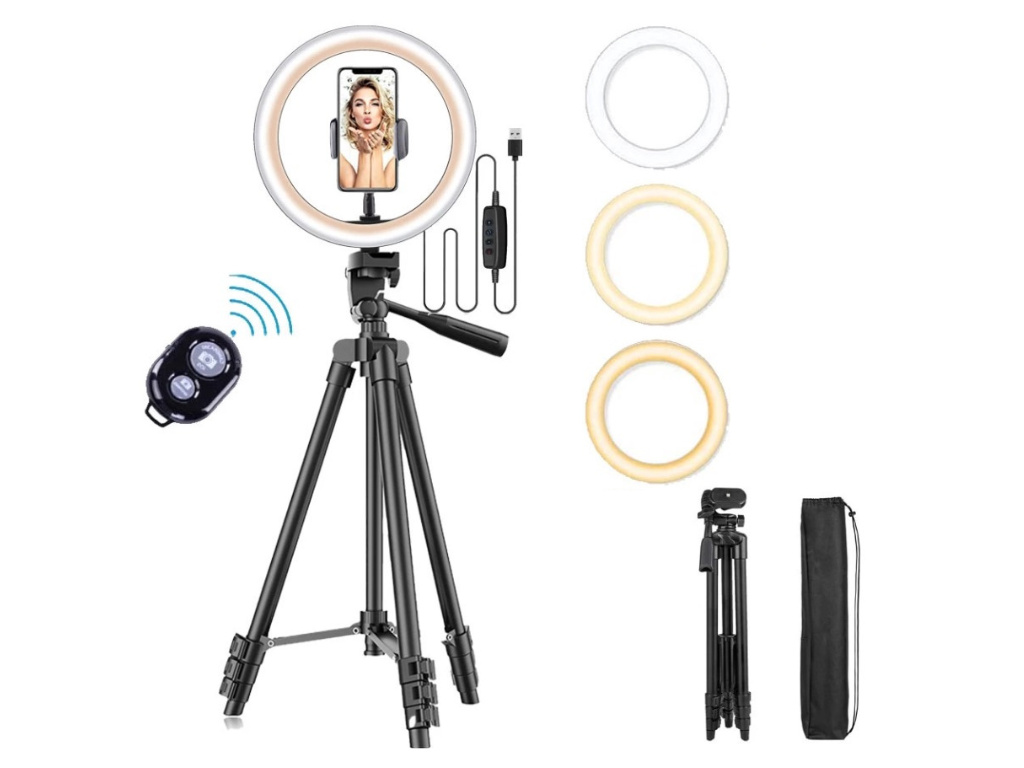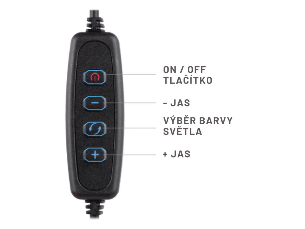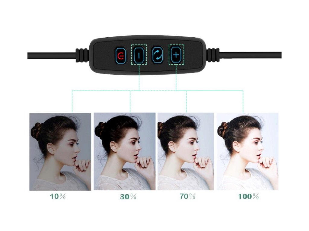Kompletné nové vybavenie na fotenie, natáčanie self videa alebo dokonca na líčenie. Možno položiť na stôl alebo aj pred stôl (statív má až 1,02 metra). Priemer svetelného kruhu má 26 cm a pre pohodlné ovládanie je na dlhom kábli umiestnený regulátor jasu a farby svetla. V balení navyše dostanete bluetooth diaľkové ovládanie pre spúšťanie fotiek / videa na diaľku. Nemusíte sa tak vôbec dotýkať smartphonu. Výhodou tohto ring light setu je aj statív, ktorý je perfektne ergonomicky spracovaný a polohovateľný, vďaka nezávislých článkom na nohách tripodu a vodováhy.