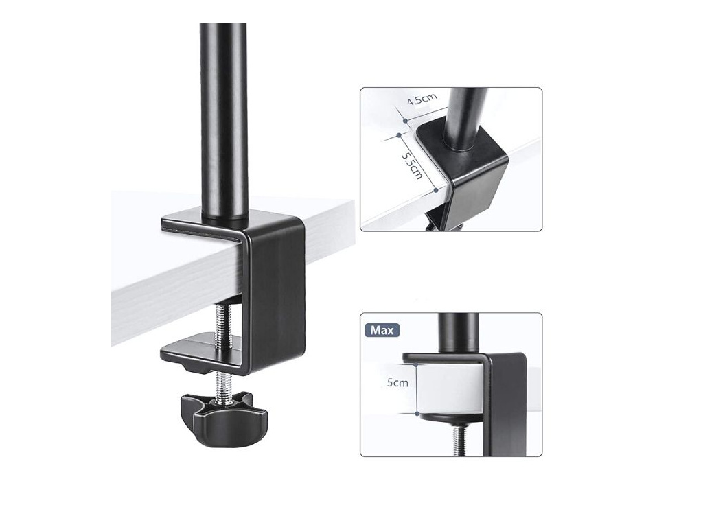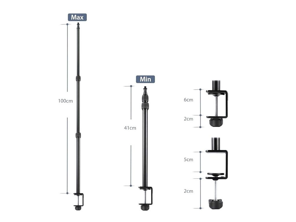 Svorka pre montáž na stôl s protišmykovou ochrannou podložkou môže pripevniť stojan k väčšine stolov, čelu postele, nočnému stolíku, kuchynskej linke atď. Použiť ho tak môžete na živé vysielanie, videokonferencie, nahrávanie videí, produktovú fotografiu a pod. Nosnosť tyče má 2 kg.