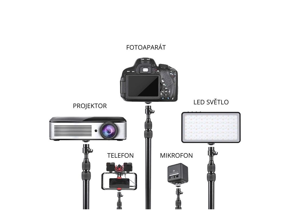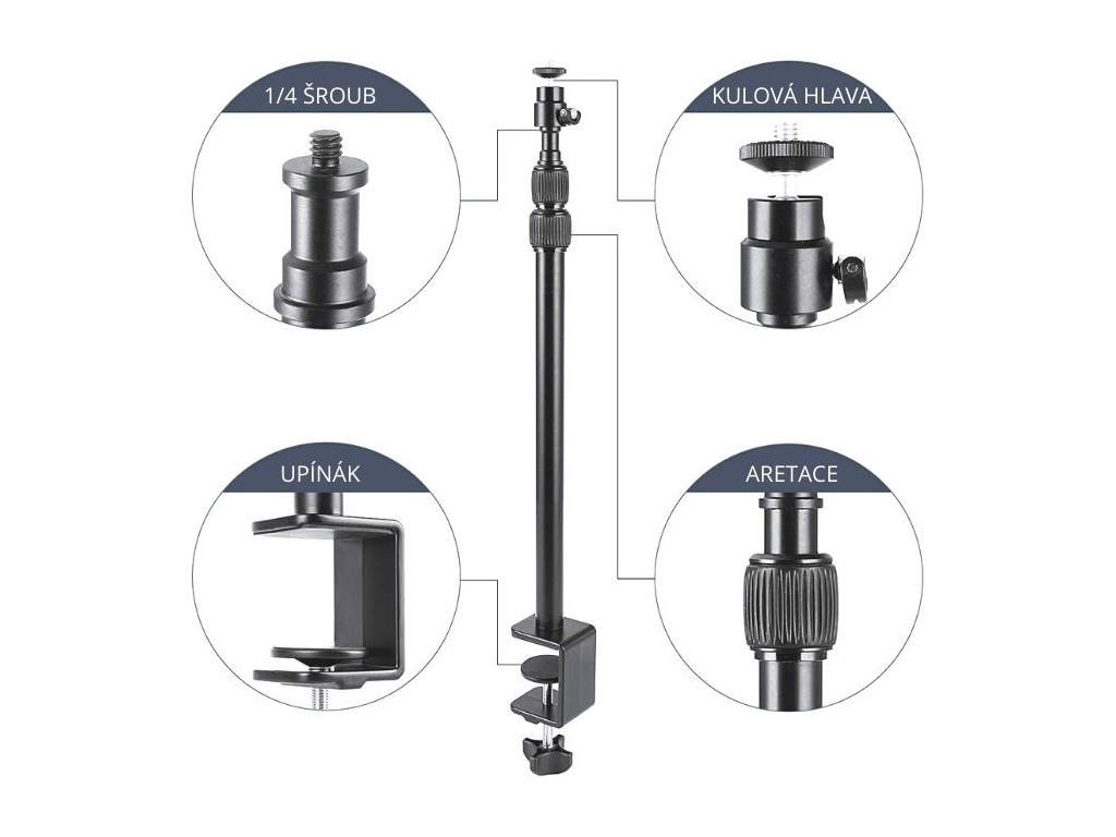Teleskopická tyč na stôl s 1/4 skrutkou na konci je spolu s guľovou statívovou hlavou praktickým spoločníkom na upevnenie napr. kruhového svetla](https://www.fotoveci.cz/kruhova/26-cm-prumer-10-kruhove-foto-svetlo-photo-video-youtube-ring-holder-bez-stativu/), držiaka na telefón alebo DSLR a ďalšie techniky.