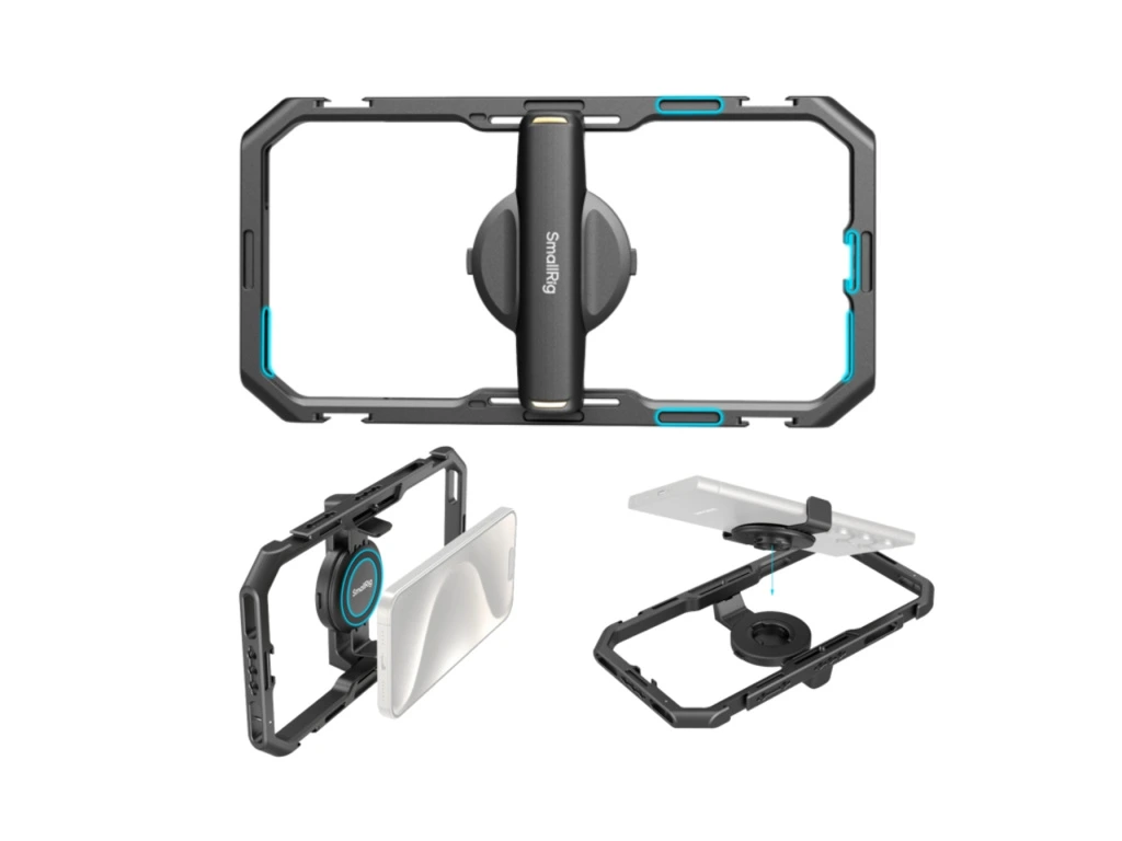 Základom je vylepšená univerzálna klietka, ktorá váš telefón pevne zaistí a vďaka množstvu 1/4" závitov a sánok (cold shoe) na ňu pripevníte čokoľvek vás napadne. Skutočnou vychytávkou je otočná rýchloupínacia rukoväť, ktorú si nastavíte do ľubovoľného uhla pre maximálne pohodlie. Jedna z rukovätí navyše obsahuje odnímateľné bezdrôtové ovládanie, takže spúšť máte pod kontrolou aj na vzdialenosť 10 metrov.