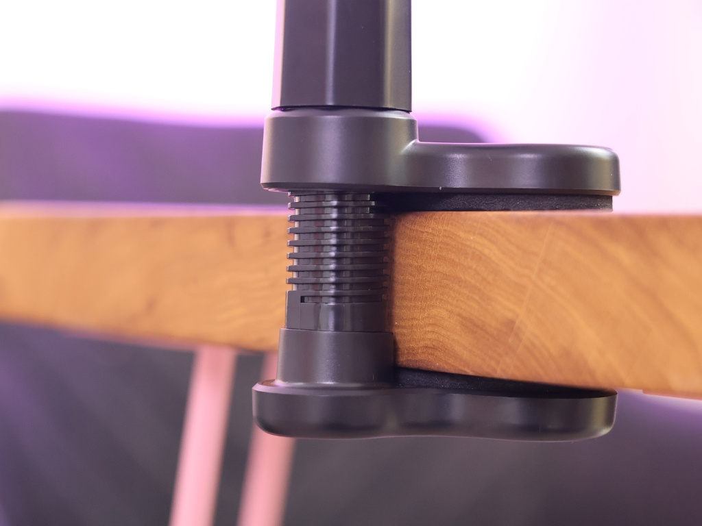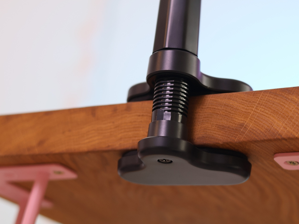 Rameno sa uchytáva k stolu jednoduchou svorkou – žiadne vŕtanie, žiadne lepenie. Svorka je nastaviteľná až do hrúbky 75mm a protišmykové podložky chránia váš nábytok pred poškriabaním.