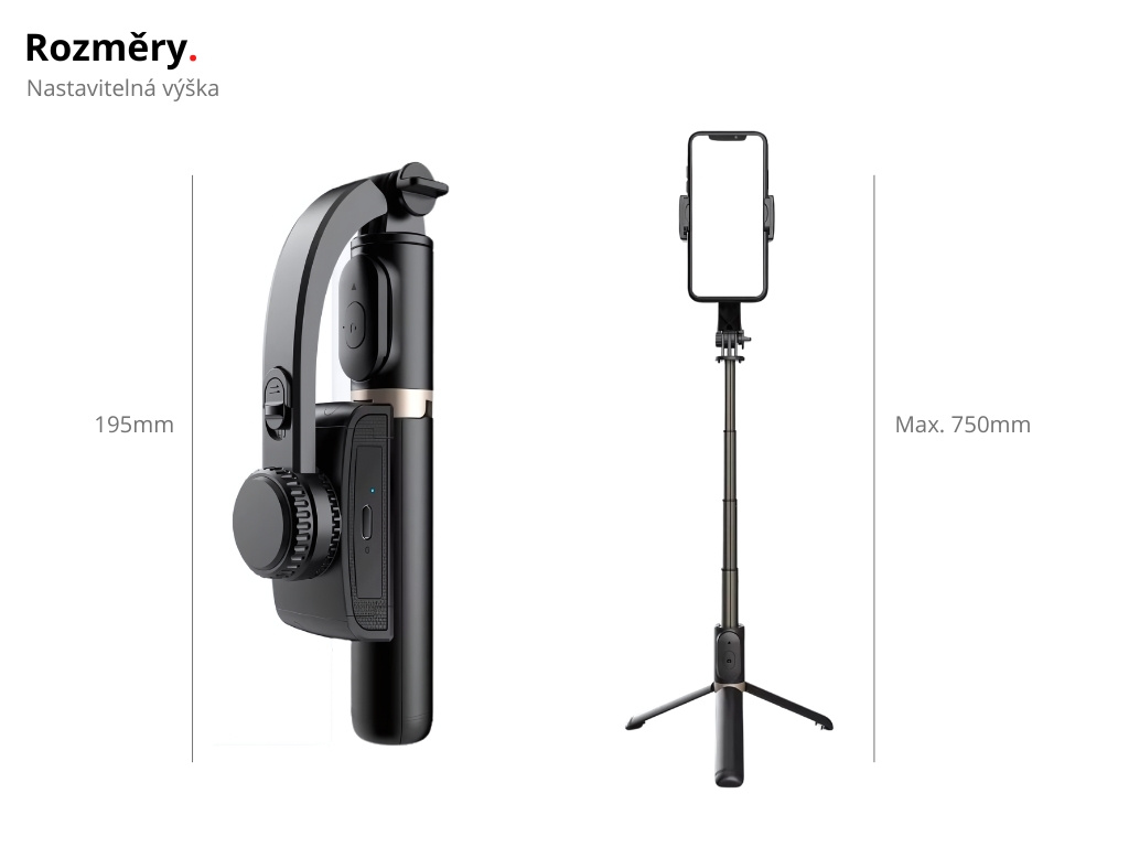 Táto vecička je naozaj multifunkčná. Využijete ju aj ako selfie tyč alebo stabilný statív s nastaviteľnou výškou v rozmedzí 195-750mm a navyše je kompatibilný ako s operačným systémom Android, tak iOS.