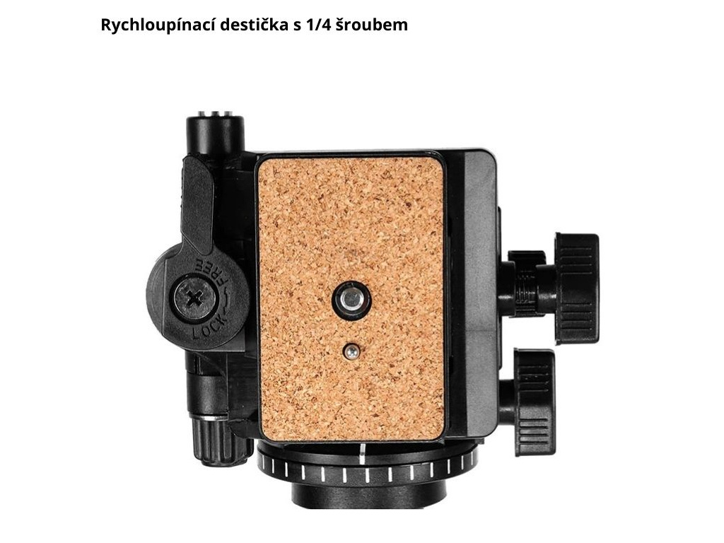 Statívovú hlavu môžete ovládať pomocou madla, ktoré je mäkčené pre pohodlný úchop. Samozrejmosťou je aj rýchloupínacia doštička s korkovým povrchom a 1/4 skrutkou.
