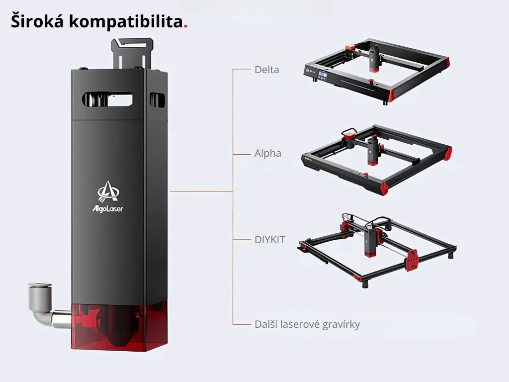 Laserová hlava so silou až 20W (podľa varianty) je široko kompatibilné zariadenie, ktoré je možné dobre prispôsobiť rôznym strojom na laserové gravírovanie. Je kompatibilný s gravírkami od značiek Algolaser či Ortur. Podmienkou je vždy použitie súčasne s Air Assist pumpou (nie je súčasťou balenia).