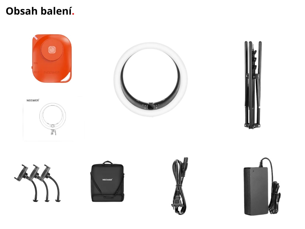 Ovládanie je jednoduché a pohodlné. Môžete ho nastaviť dotykom priamo na paneli, cez mobilnú aplikáciu Neewer alebo aj bezdrôtovo pomocou počítača. V balení nájdete výškovo nastaviteľný statív, tri držiaky na telefón, tri pätice pre príslušenstvo, praktickú tašku a aj dva USB výstupy, ktoré umožnia dobíjať telefón alebo mikrofón počas natáčania.