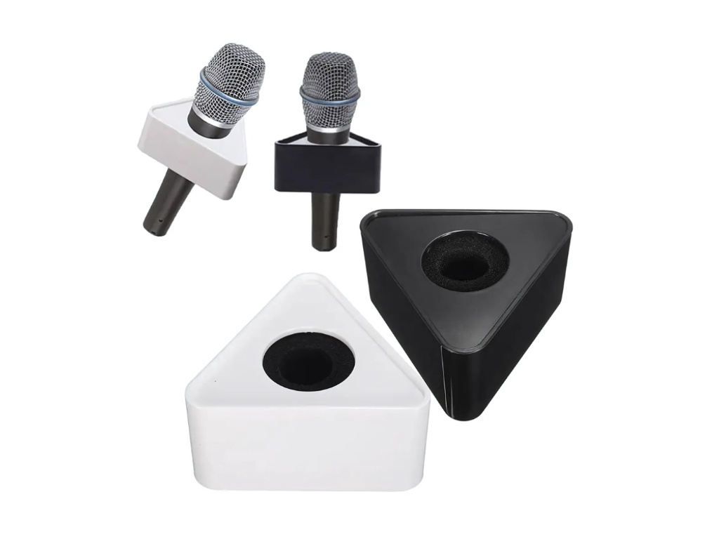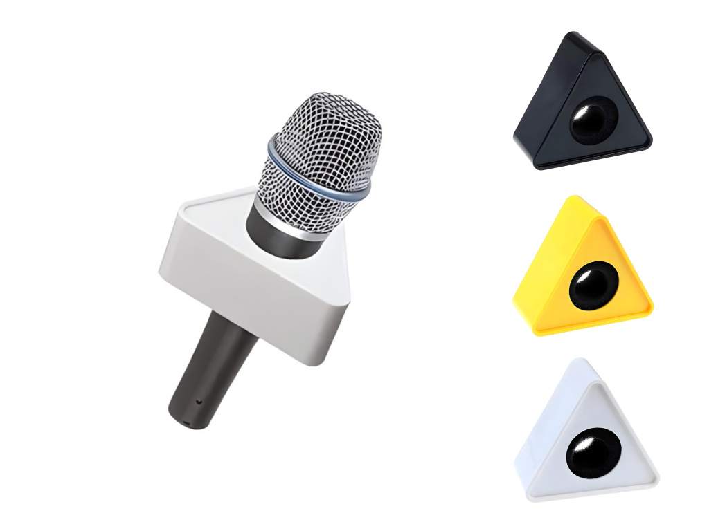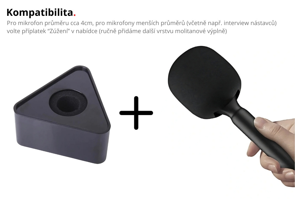 Trojuholník je navrhnutý pre bežné ručné mikrofóny s priemerom okolo 4cm, takže pri štandardných mikrofónoch nemusíte nič riešiť. Ak máte užší model alebo chcete trojuholník kombinovať s našimi interview nástavcami, môžete si v ponuke zvoliť variant „Zúženie“. Vďaka tomu bude držať presne tak, ako má.