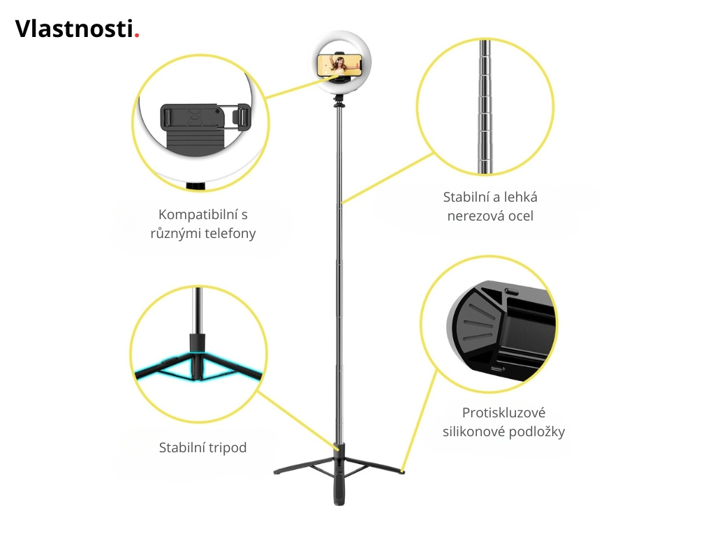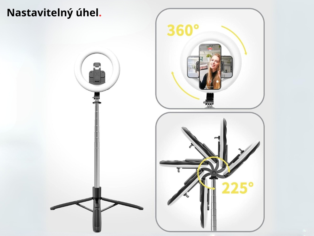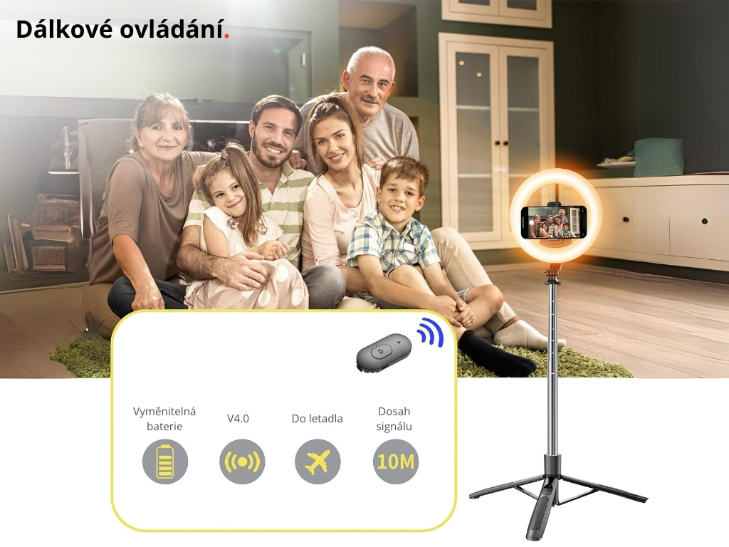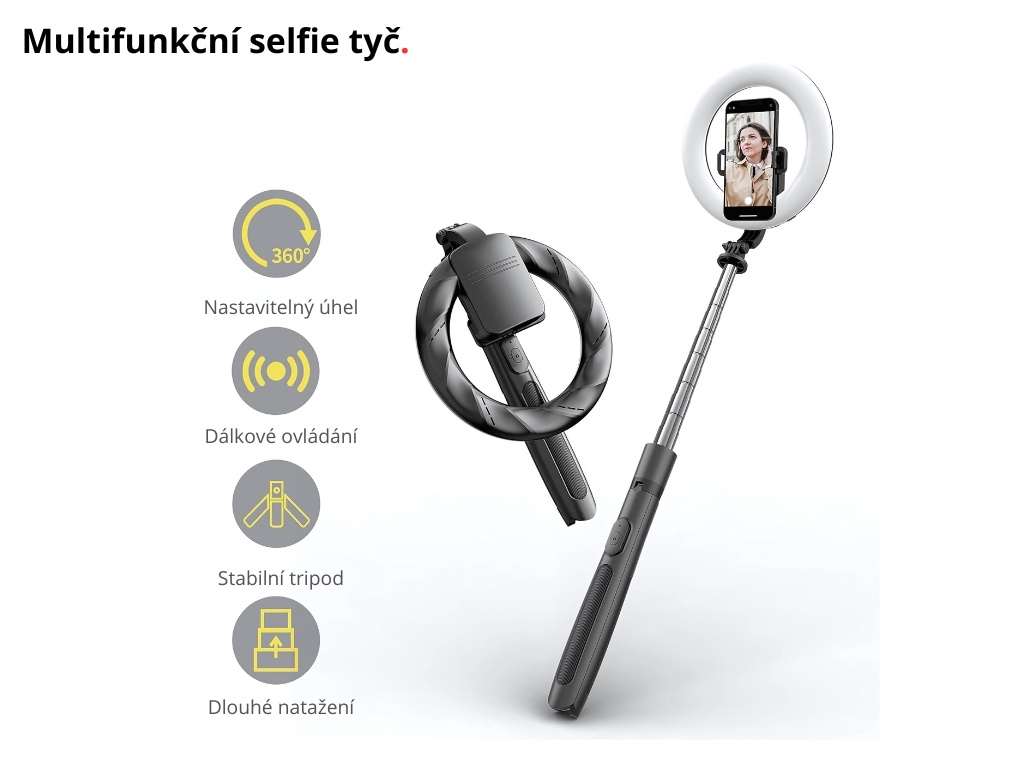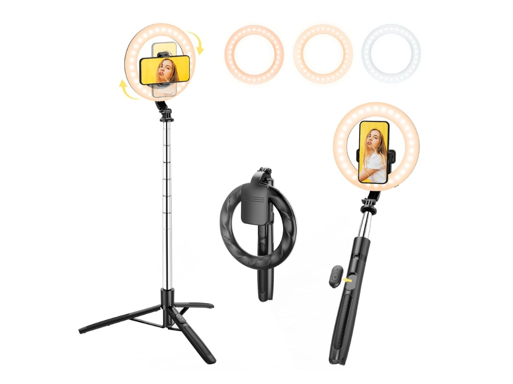 Selfie tyč je vybavená kruhovým svetlom. Má tri svetelné módy a nastaviteľnú farbu svetla v rozmedzí 3000-6500K. Navyše disponuje bezdrôtovým diaľkovým ovládaním a je kompatibilný s iOS aj Android.