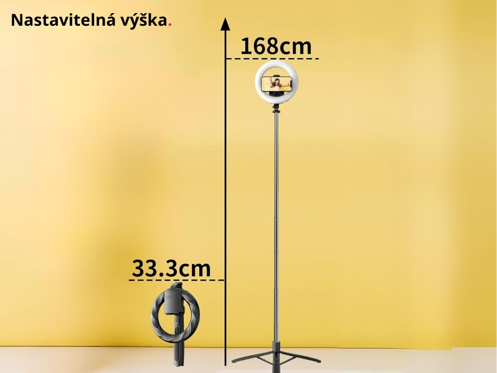 Univerzálna teleskopická selfie tyč so statívom má a kruhovým svetlom v zloženom stave iba 33,3cm a pri rozložení dosahuje dĺžku až neuveriteľných 168cm. Statív je vyrobený z odolného plastu a nerezovej ocele.