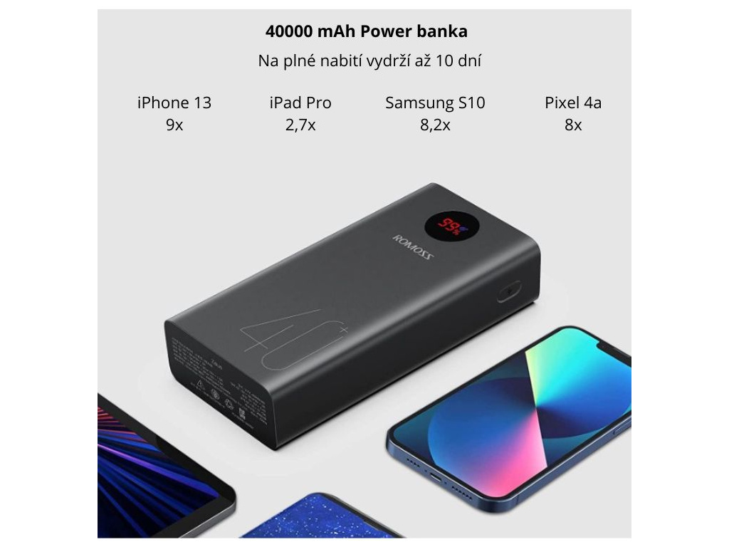 Výkonná veľkokapacitná powerbanka Romoss má neuveriteľnú kapacitu a to 40.000 mAh. Powerbanka vám poskytne dostatok energie pokojne po celý týždeň. Má inteligentnú funkciu, kedy rozpozná typ pripojeného zariadenia. Konštrukcia je veľmi odolná a vyrobená z nehorľavého trojitého plášťa a spĺňa tak štandardy pre cestu lietadlom.