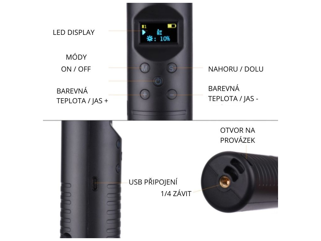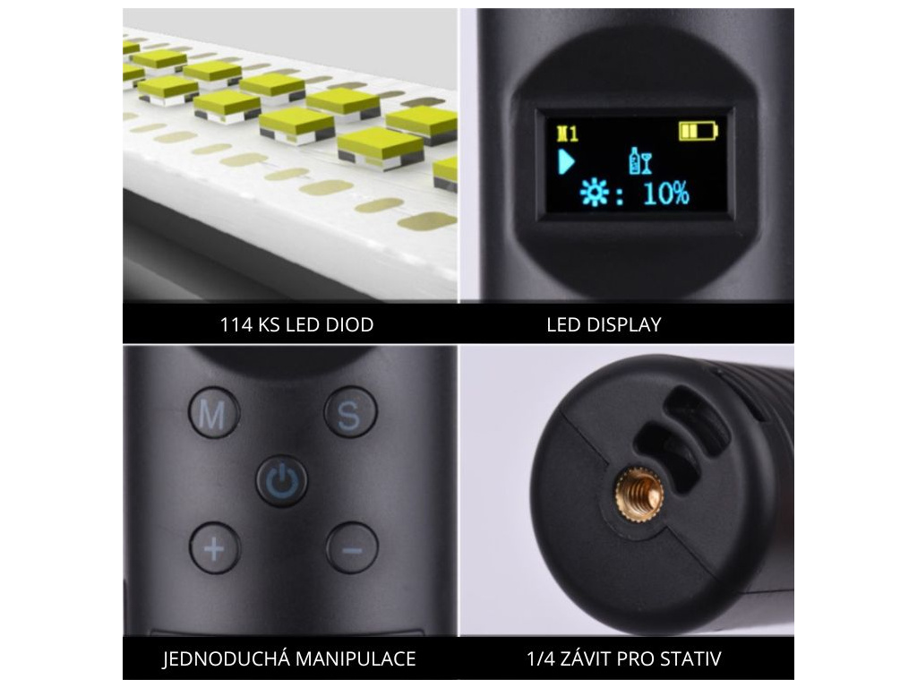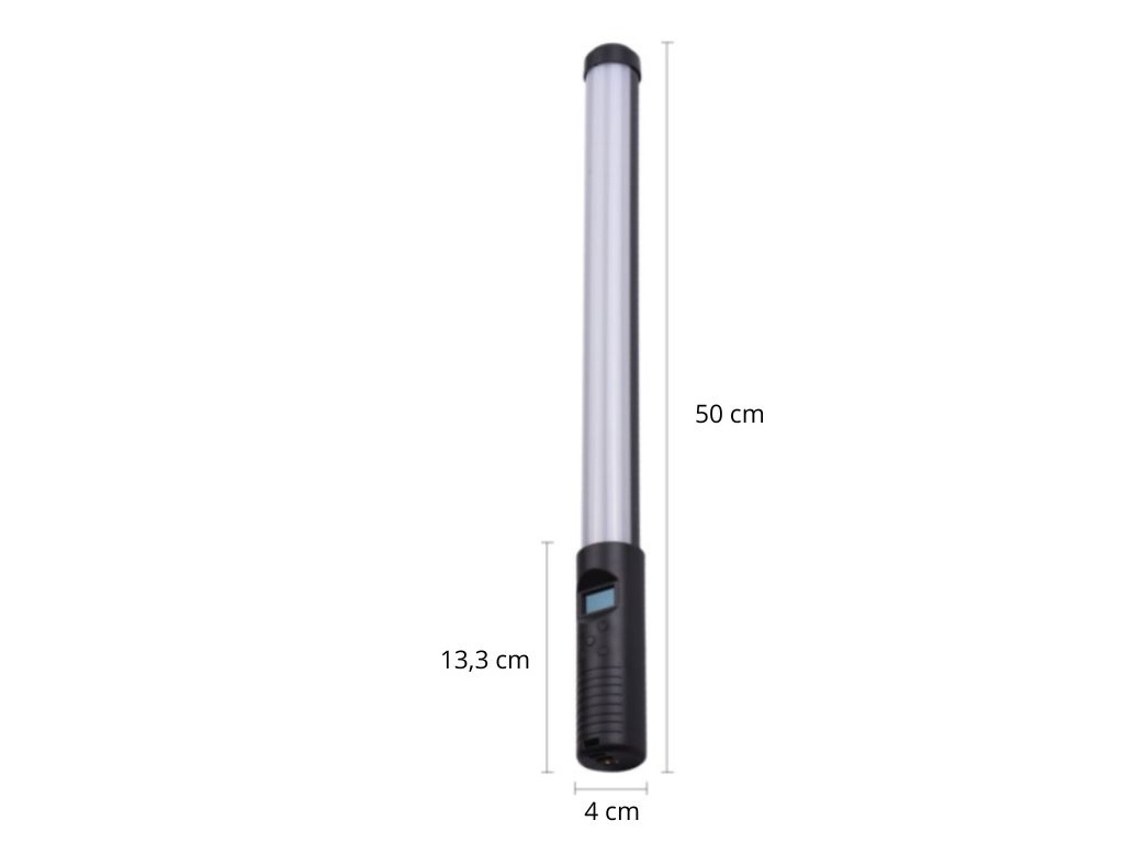 Svetelná LED RGB tyč je skvelou lampou na fotenie či natáčanie rôznych efektných snímok. Využiť ju môžete predovšetkým v exteriéri, pretože je vybavená batériou s kapacitou 2000mAh a vydrží v plnej prevádzke až 1,5 hodiny. Následne je možné RGB tyč pripojiť napríklad do powerbanky pomocou USB kábla a dobiť. Výhodou je navyše prenosné puzdro a diaľkové ovládanie. RGB trubica má 5 rôznych módov a môžete si nastaviť farbu podľa ľubovôle. Nastavenie farebnej teploty 3000 – 6500K alebo jasu (0–100%) je samozrejmosťou. Výkon LED lampy je skvelých 2000lm, osvetlí tak skutočne veľkú plochu.