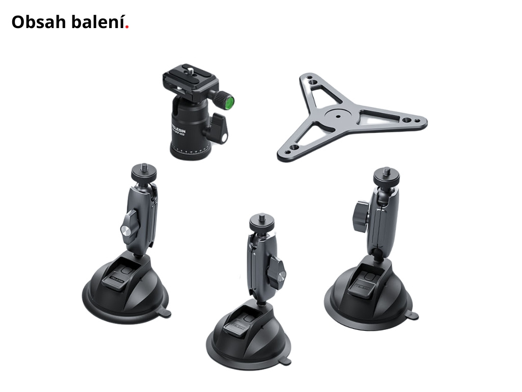 Vďaka trom samostatným prísavkám a priloženému adaptéru s 1/4” závitom je ideálny na uchytenie na autá, prilby, okná a ďalšie hladké povrchy. Vhodný pre športové natáčanie, vlogy aj filmovú tvorbu.