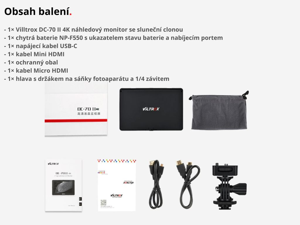 - 1× Villtrox DC-70 II náhľadový monitor so slnečnou clonou