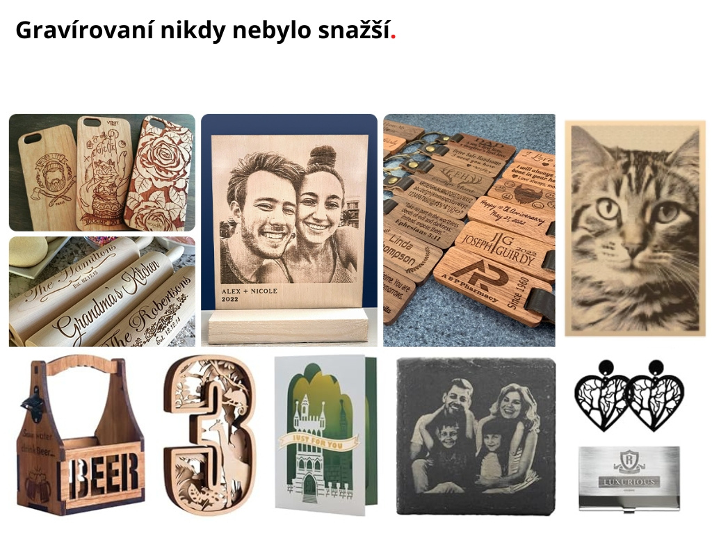 - Podporované materiály: drevo, akryl, koža, papier, nerezová oceľ, hliník, meď, sklo (s povrchovou úpravou) a ďalšie