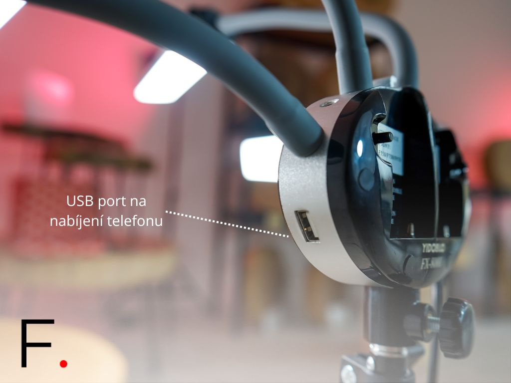 Vícenásobný napájecí zdroj má namontovaný USB port, kterým lze dobíjet telefon během svícení, nebo možnost napájení pomocí dvou baterií NP-F750 (není součástí balení). Díky tomu, může být Octopus plně mobilní. Spolehlivě osvětlí jak detail u produktového focení, tak portréty nebo celé postavy. Foto ani video není problém. Popřípadě pomocí adaptéru můžete upevnit i fotoaparát, adaptér ale není součástí balení.