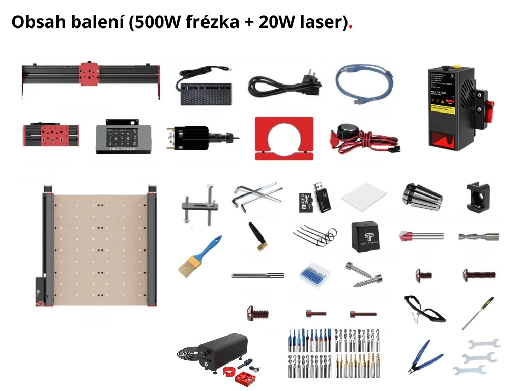 - 1x 20W laserová hlava (Varianta 500W + 20W laser)