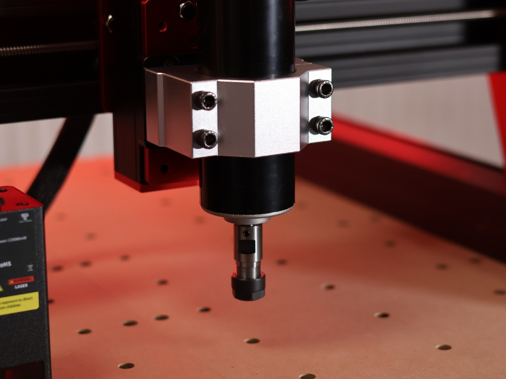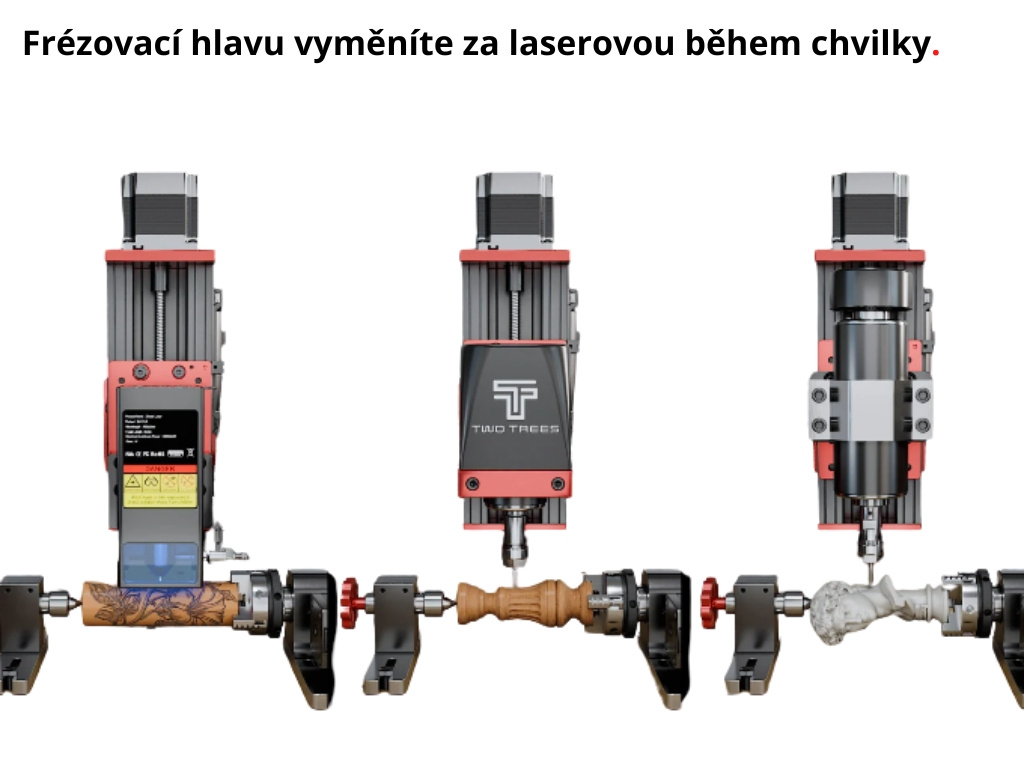 Tenhle stroj podporuje vřeteno se vstupním výkonem od 120W (výstup 80W) až po nejvýkonnejší 800W verzi, a navíc i volitelný výměnný 20W laserový modul nebo dokonce i rotační válec. Hlavu lze jednoduše vyměnit za laserovou během pár desítek sekund a kombinovat tak frézování s laserovým gravírováním nebo řezáním. Doporučená doba souvislého provozu je do 6 hodin.